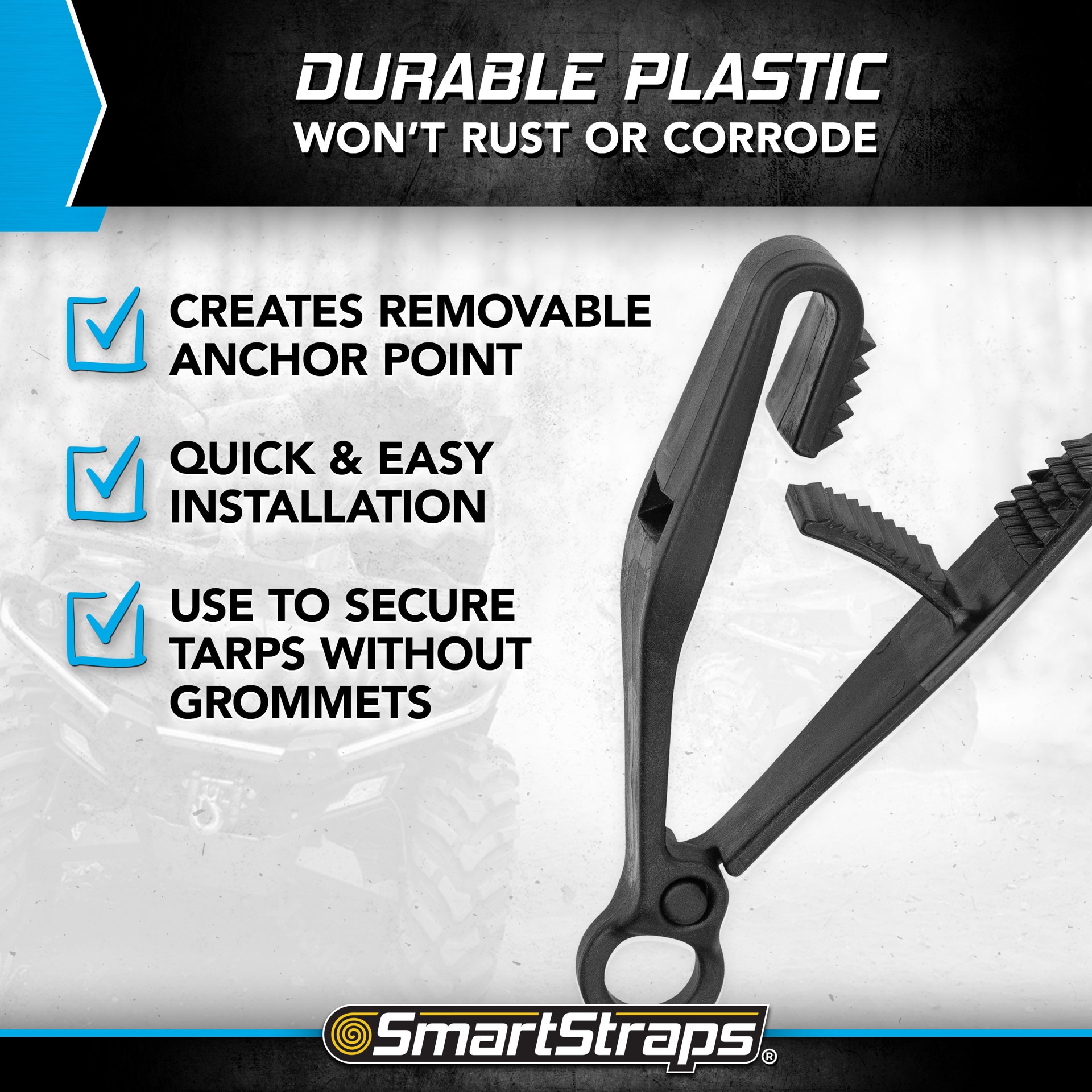 Used to create an anchor point for tarps. For light duty applications. Great for camping, hiking, and fishing. Plastic construction. Quick and easy installation. Removable and convenient. Includes 1 t…