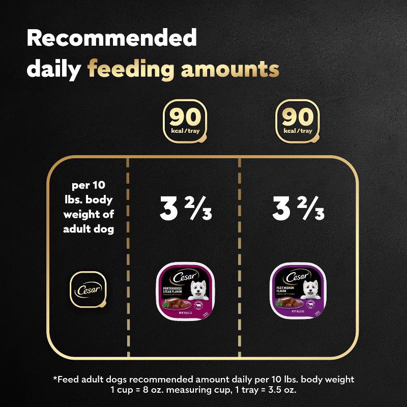 - Variety Pack: Contains twelve (12) 3.5 oz. trays of Cesar Classic Loaf in Sauce Wet Dog Food Variety Pack: (6) Filet Mignon Flavor, (6) and Porterhouse Steak Flavor.