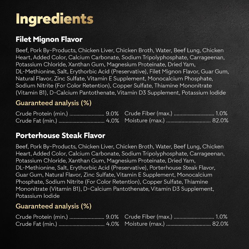 Cesar Classic Loaf in Sauce Filet Mignon Flavor: Beef, Pork By-Products, Chicken Liver, Chicken Broth, Water, Beef Lung, Chicken Heart, Added Color, Calcium Carbonate, Sodium Tripolyphosphate, Carrage…