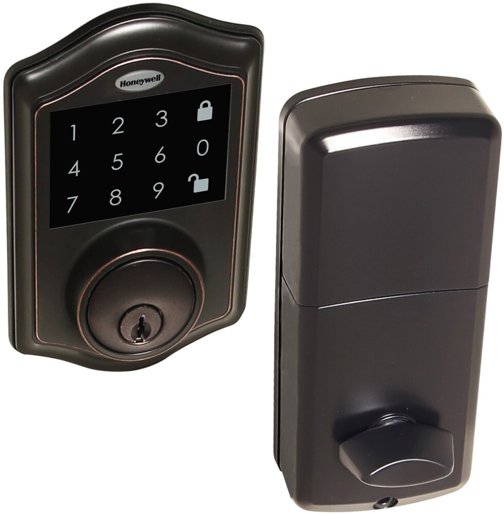 The Honeywell Electronic Entry Deadbolt features a convenient one-touch locking system, 50 programmable user codes, and an alarm that sounds after four incorrectly entered user codes for added securit…