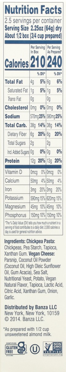 Chickpea Pasta: Chickpeas, Pea Starch, Tapioca, Xanthan Gum. Vegan Cheese: Parsnip, Salt, Nutritional Yeast, Tapioca, Vegan Natural Flavors, Coconut Oil Powder (Coconut Oil, Sunflower Oil, Gum Acacia)…