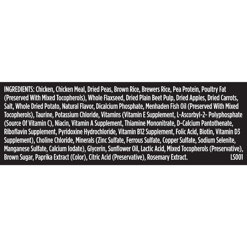 Chicken, Chicken Meal, Dried Peas, Brown Rice, Brewers Rice, Pea Protein, Poultry Fat (Preserved with Mixed Tocopherols), Whole Flaxseed, Dried Plain Beet Pulp, Dried Apples, Dried Carrots, Salt, Whol…
