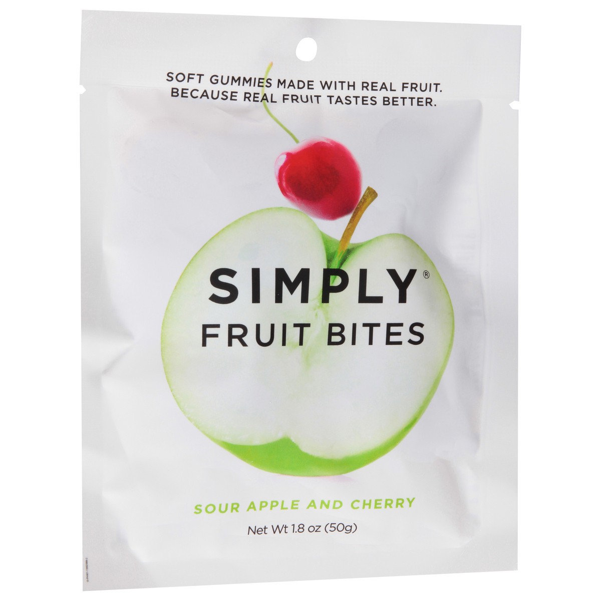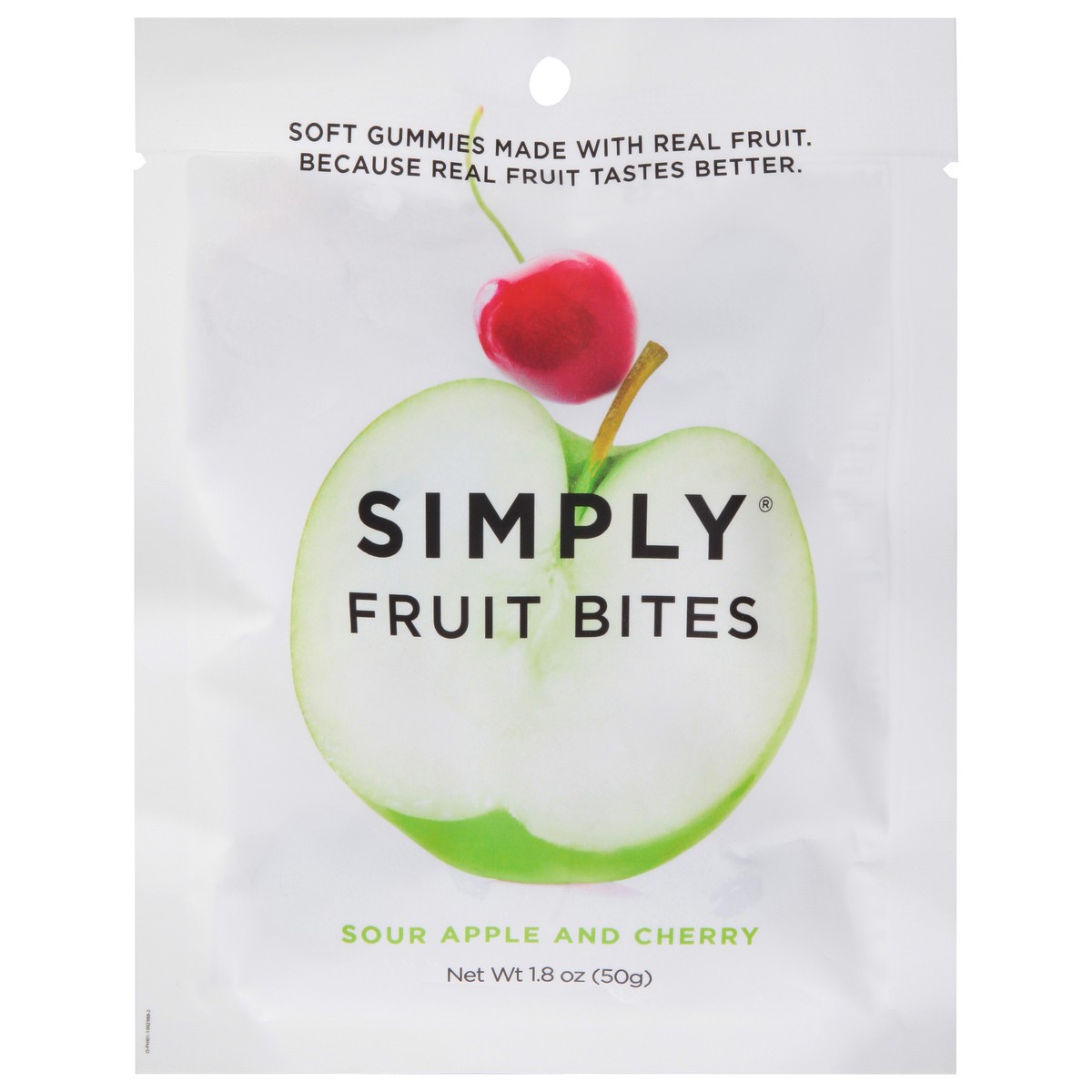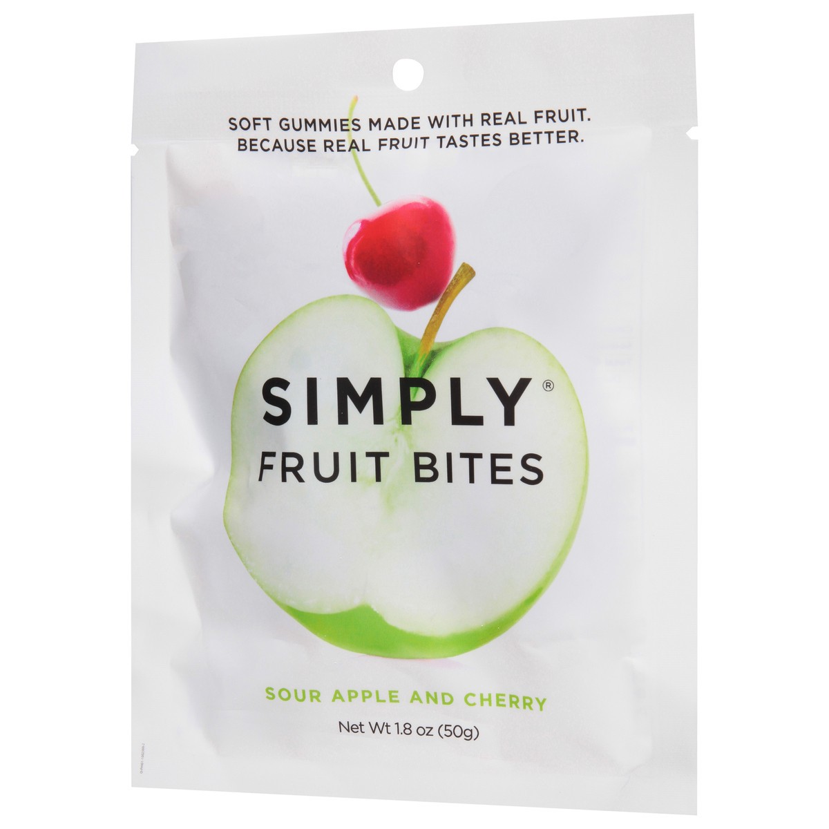 Gluten free. Vegan. Non-GMO ingredients. Soft gummies made with real fruit. Because real fruit tastes better. No cane sugar. Like a little sour with your sweet? Simply's sour apple & cherry fruit bite…