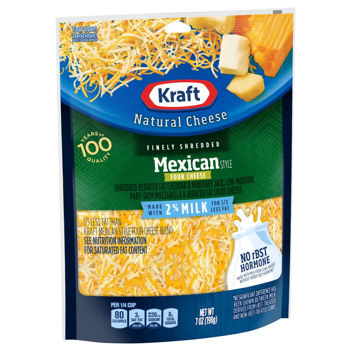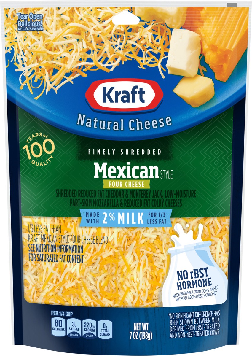 - Enhance your next meal with Kraft Shredded 2% Milk Reduced Fat Mexican Style Four Cheese Blend