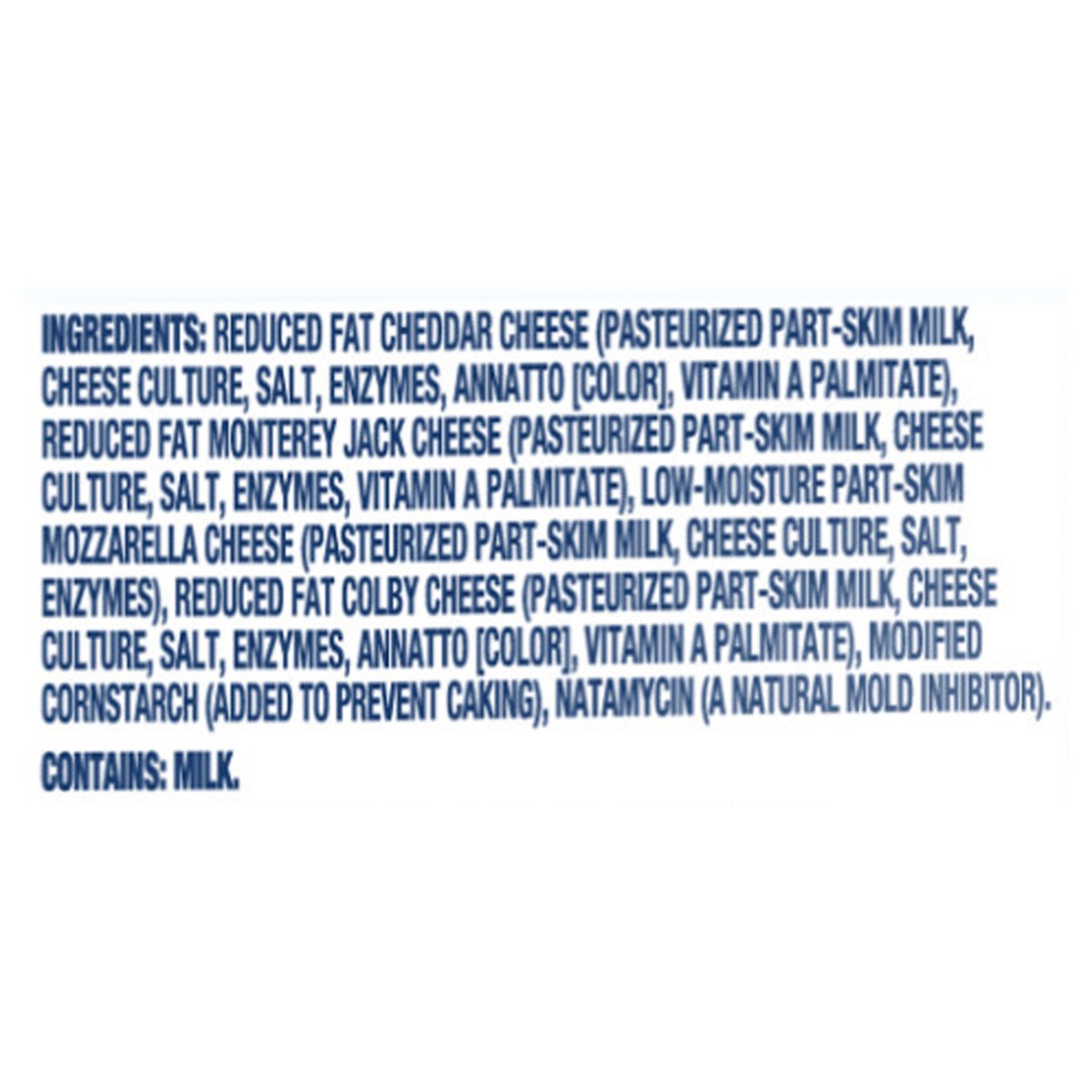 Reduced Fat Cheddar Cheese (Pasteurized Part-Skim Milk, Cheese Culture, Salt, Enzymes, Annatto [Color], Vitamin A Palmitate), Reduced Fat Monterey Jack Cheese (Pasteurized Part-Skim Milk, Cheese Cultu…