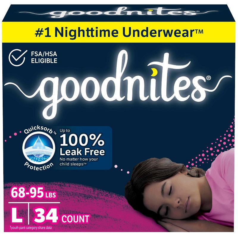 - Goodnites Girls' Bedwetting Underwear: 34 overnight underwear for girls, size large (68-95 lbs)