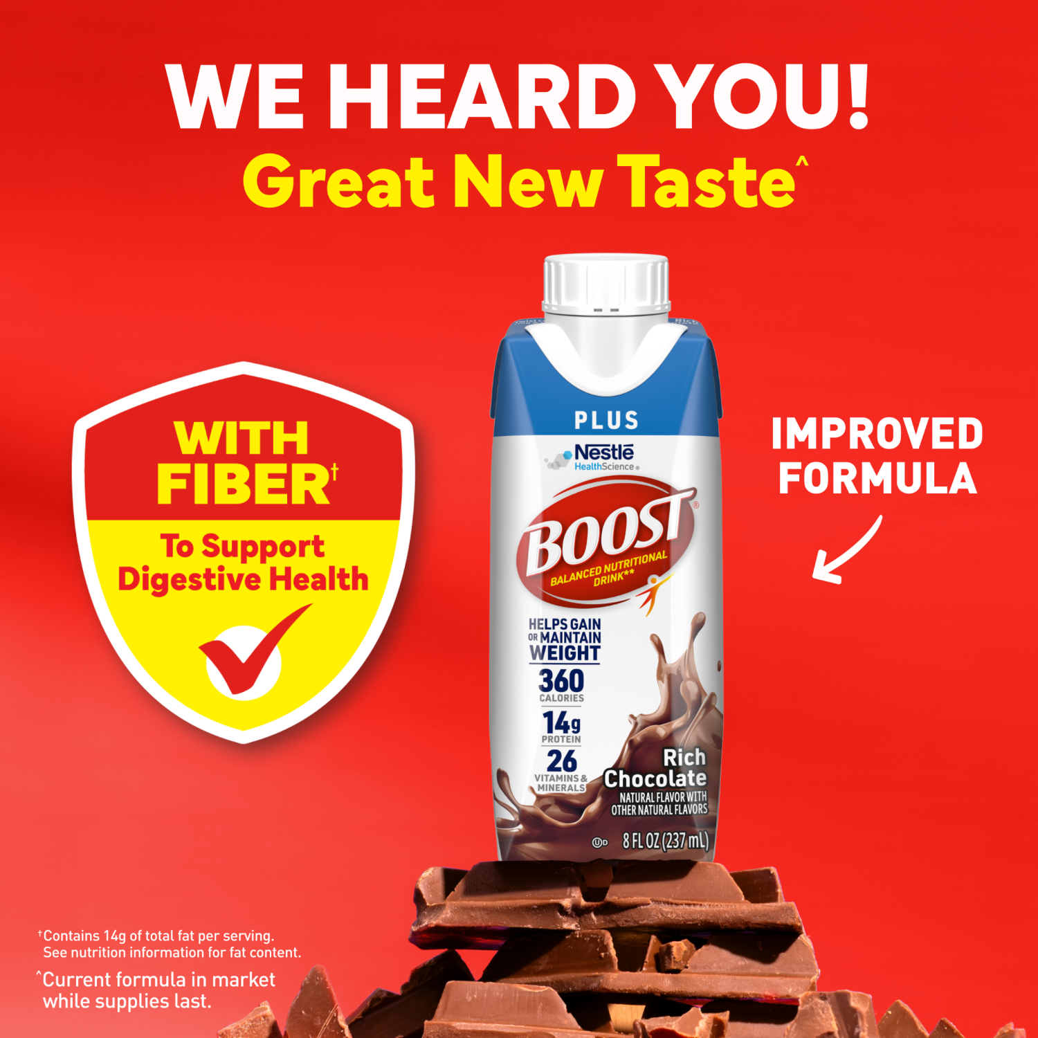 BOOST Plus Rich Chocolate Flavored Nutritional Drink is a calorically dense protein shake that delivers complete and balanced nutrition as part of a healthy diet. Each 8 fl oz carton provides 360 nutr…
