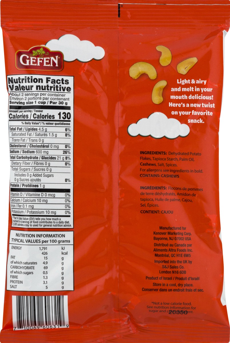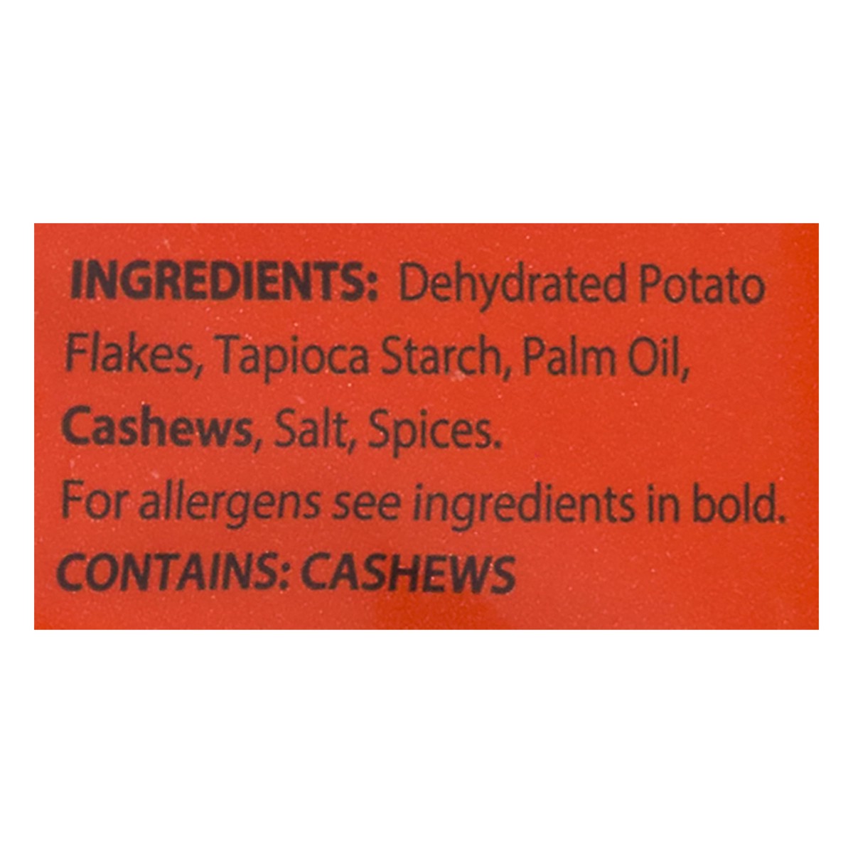 Dehydrated Pot Flakes, Tapioca Starch, Palm Oil, Cashews, Salt, Spices.