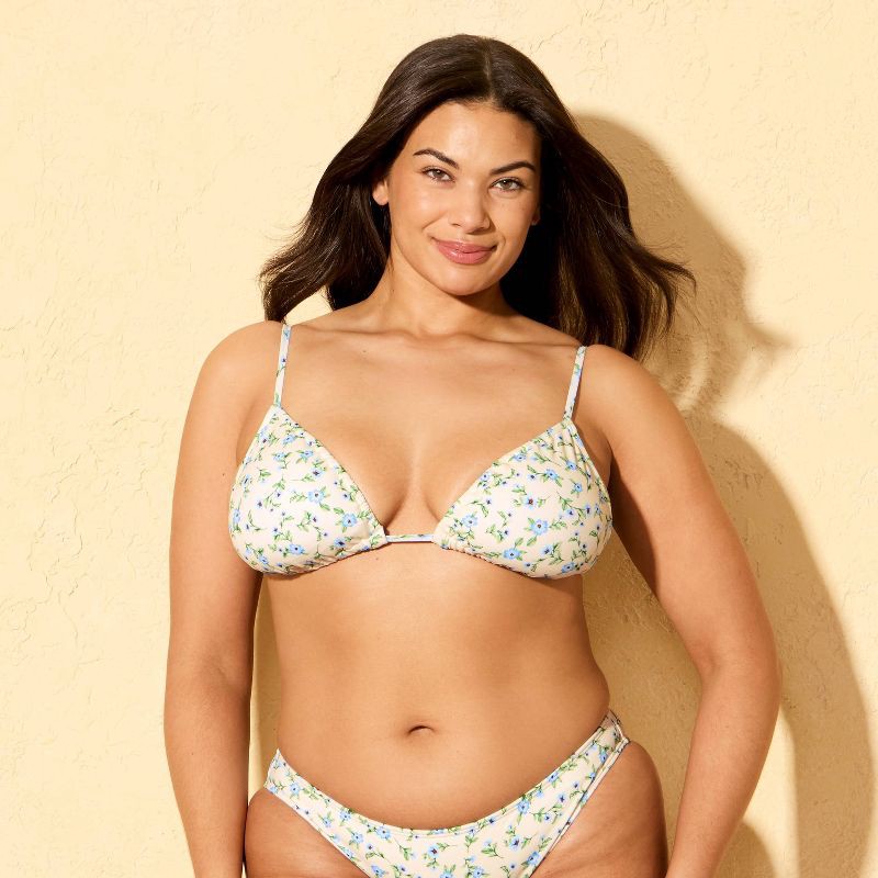 Bring garden-inspired style to the beach or pool with this Floral Cinched Triangle Bikini Top from Shade & Shore™. This triangle bikini top features soft floral motifs in blue and green against a crea…