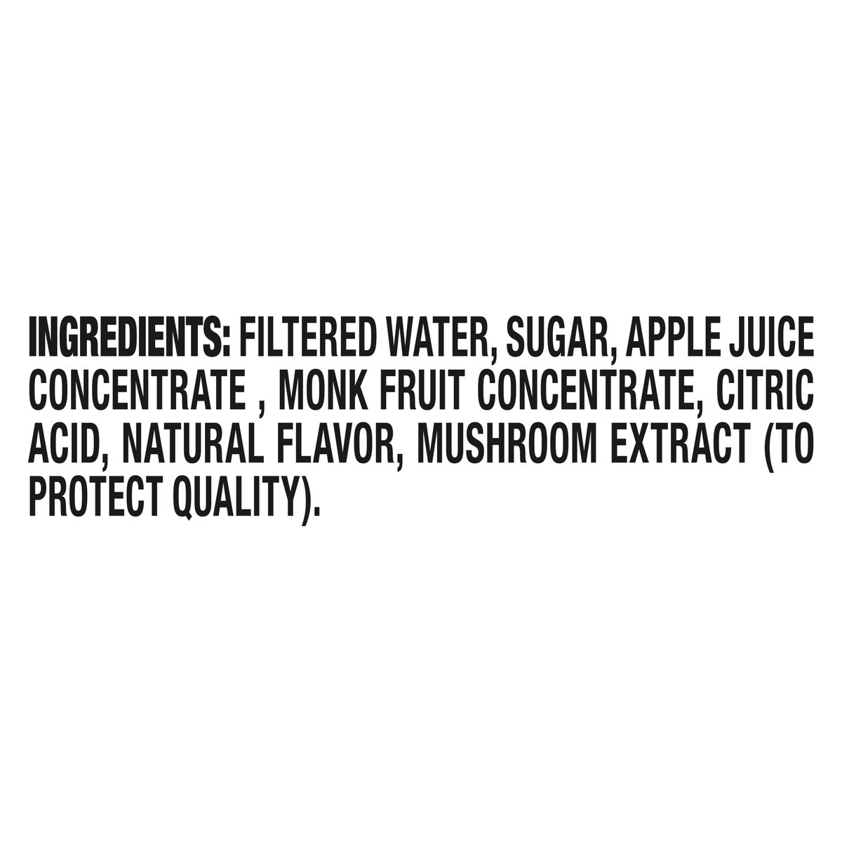 FILTERED WATER, SUGAR, APPLE JUICE CONCENTRATE , CITRIC ACID, MONK FRUIT CONCENTRATE, NATURAL FLAVOR, MUSHROOM EXTRACT (TO PROTECT QUALITY).