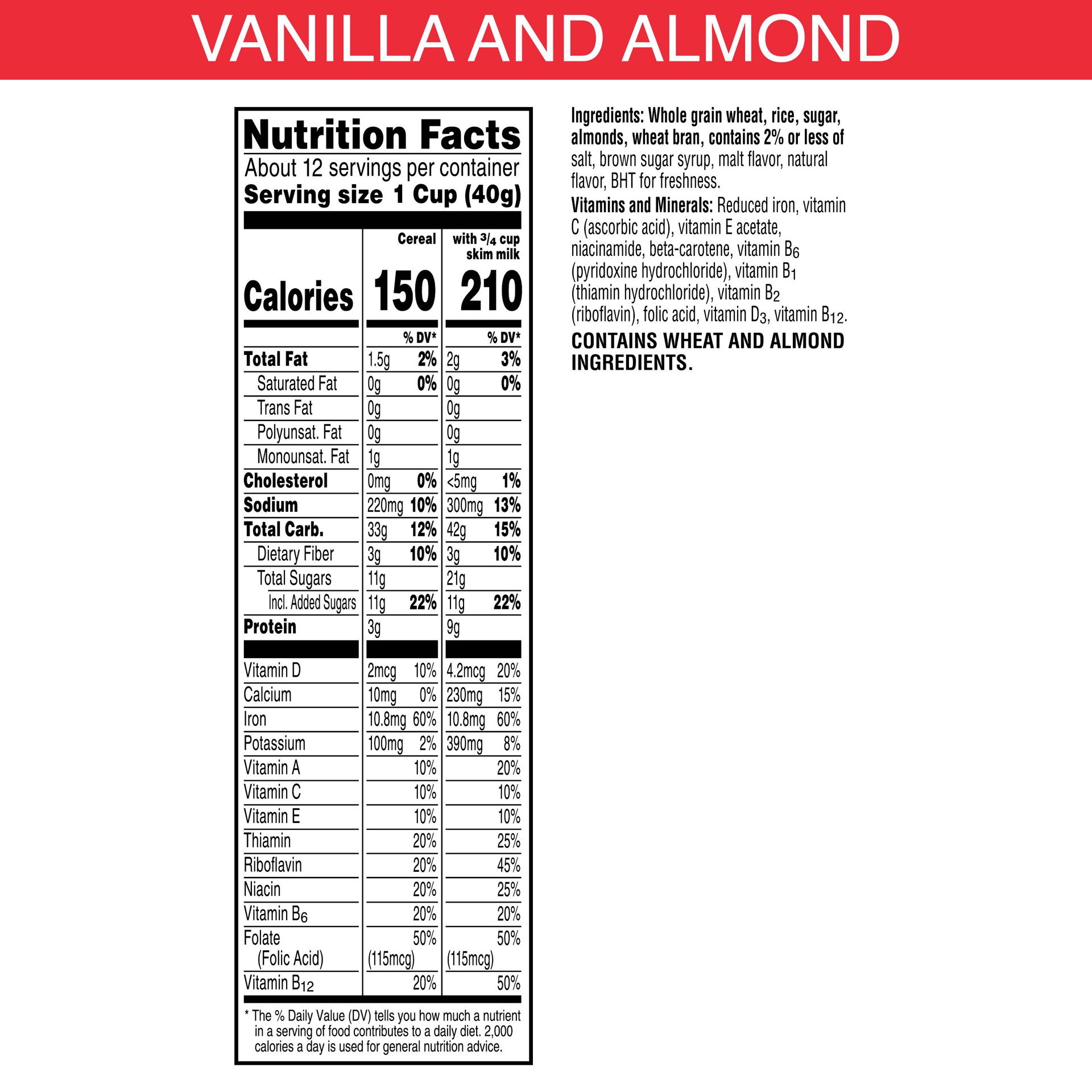 - Crunchy wheat and rice flakes made with vanilla and real almonds in every serving