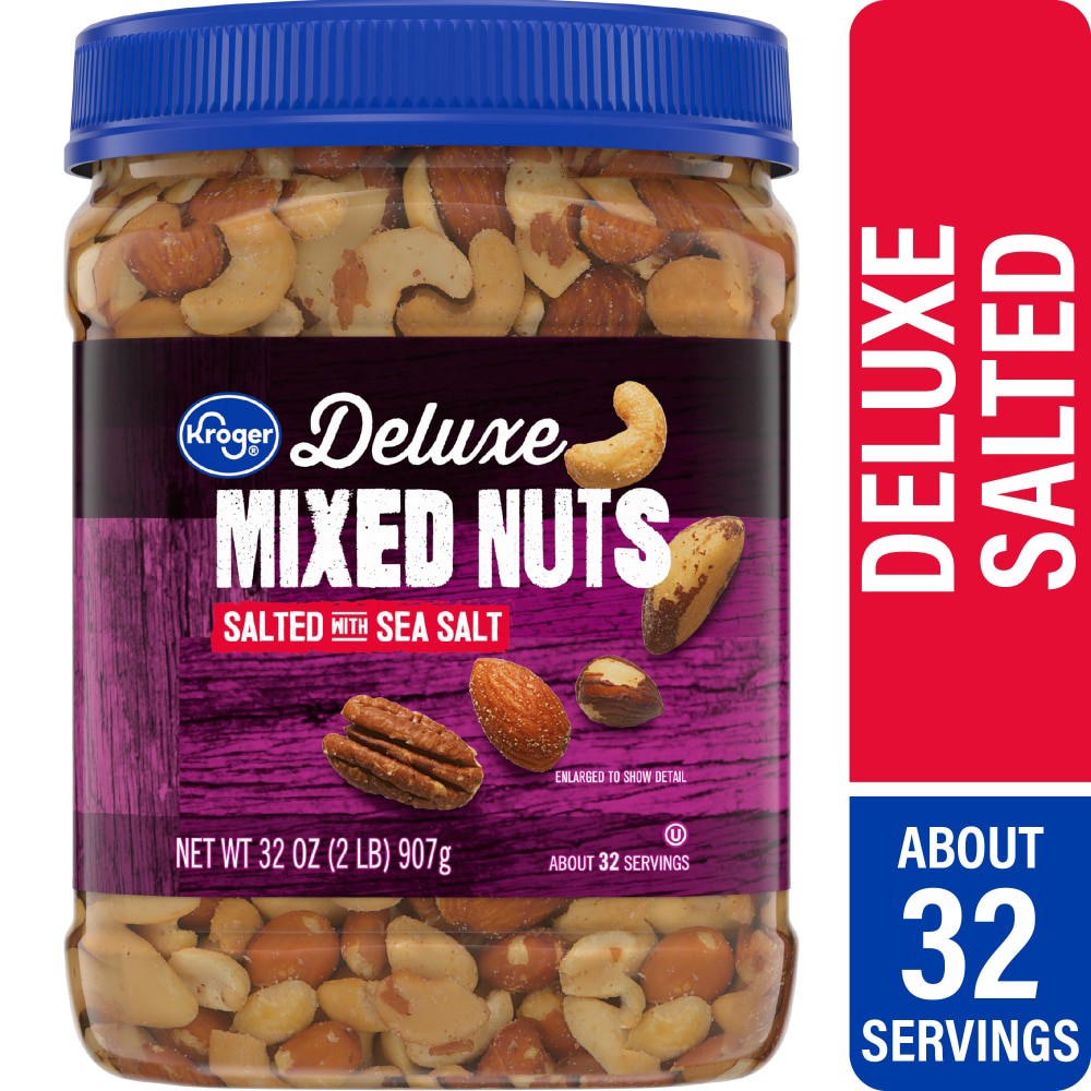Kroger® Salted Deluxe Mixed Nuts make snacking a joy. Tickle your taste buds with salty goodness in every handful of this mix with cashews, almonds, pecans, Brazil, and hazelnuts. Cooked in strictly c…