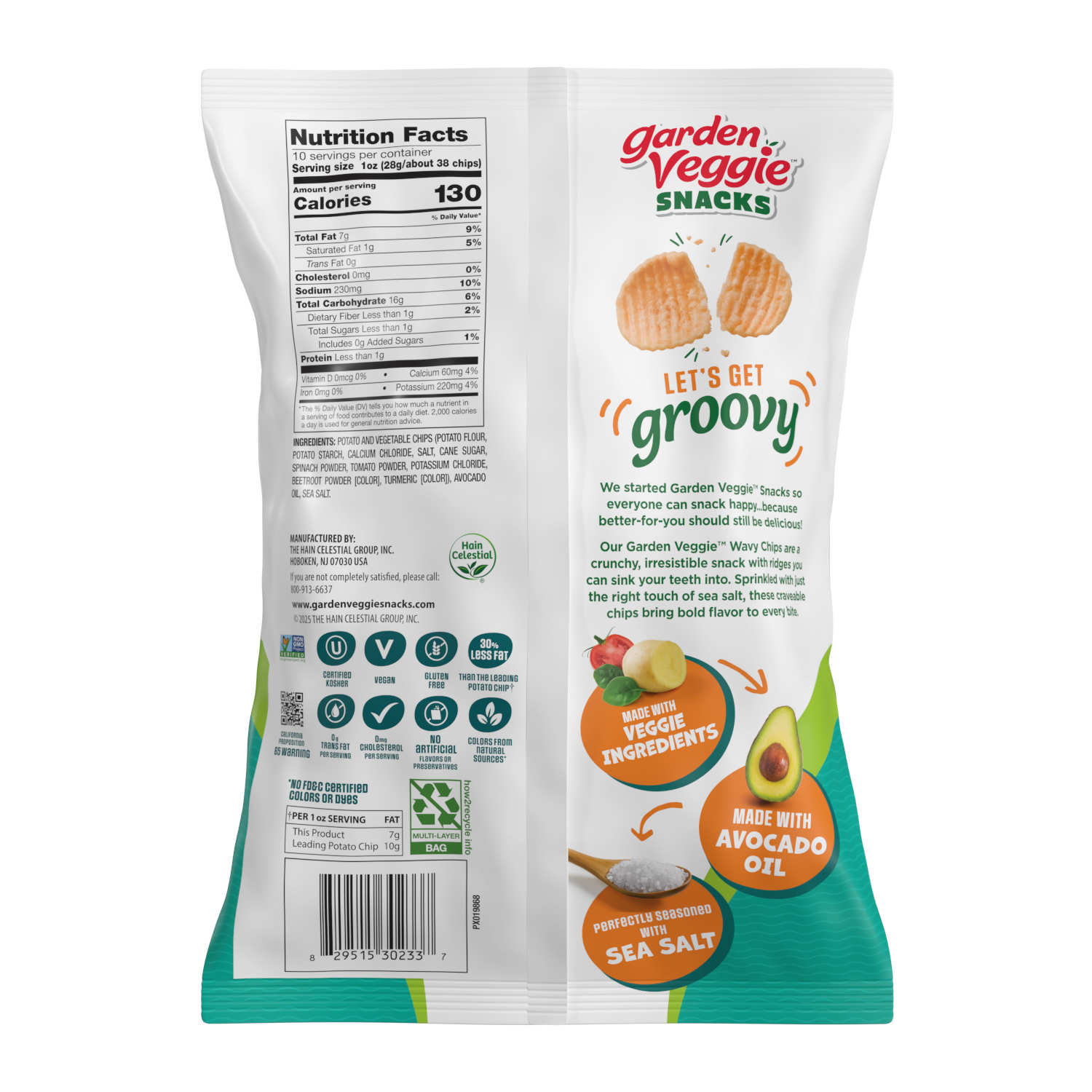 Potato and Vegetable Chips (Potato Flour, Potato Starch, Calcium Chloride, Salt, Cane Sugar, Spinach Powder, Tomato Powder, Potassium Chloride, Beetroot Powder [Color], Turmeric [Color]), Avocado Oil,…
