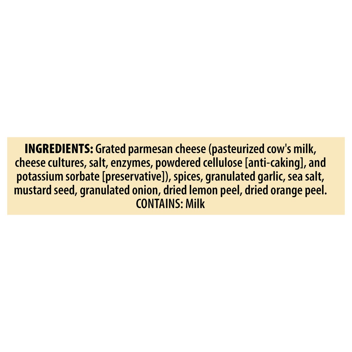 Grated Parmesan Cheese (Pasteurized Cow''s Milk, Cheese Cultures, Salt, Enzymes, Powdered Cellulose [Anti-Caking], and Potassium Sorbate [Preservative]), Spices, Granulated Garlic, Sea Salt, Mustard S…