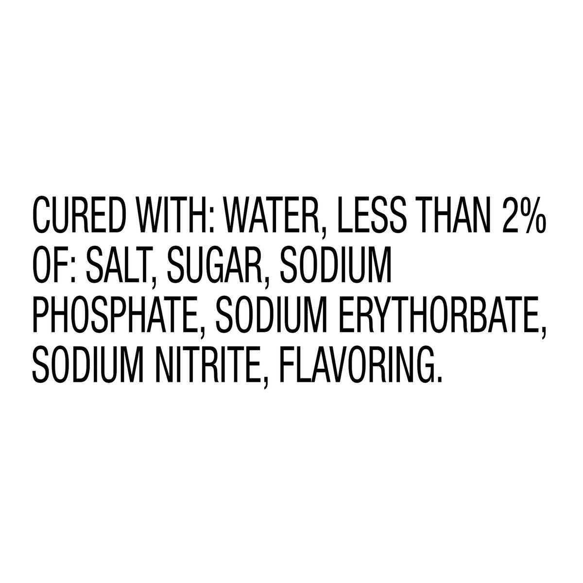 Cured with: Water, Less than 2% of: Salt, Sugar, Sodium Phosphate, Sodium Erythorbate, Sodium Nitrite, Flavoring.