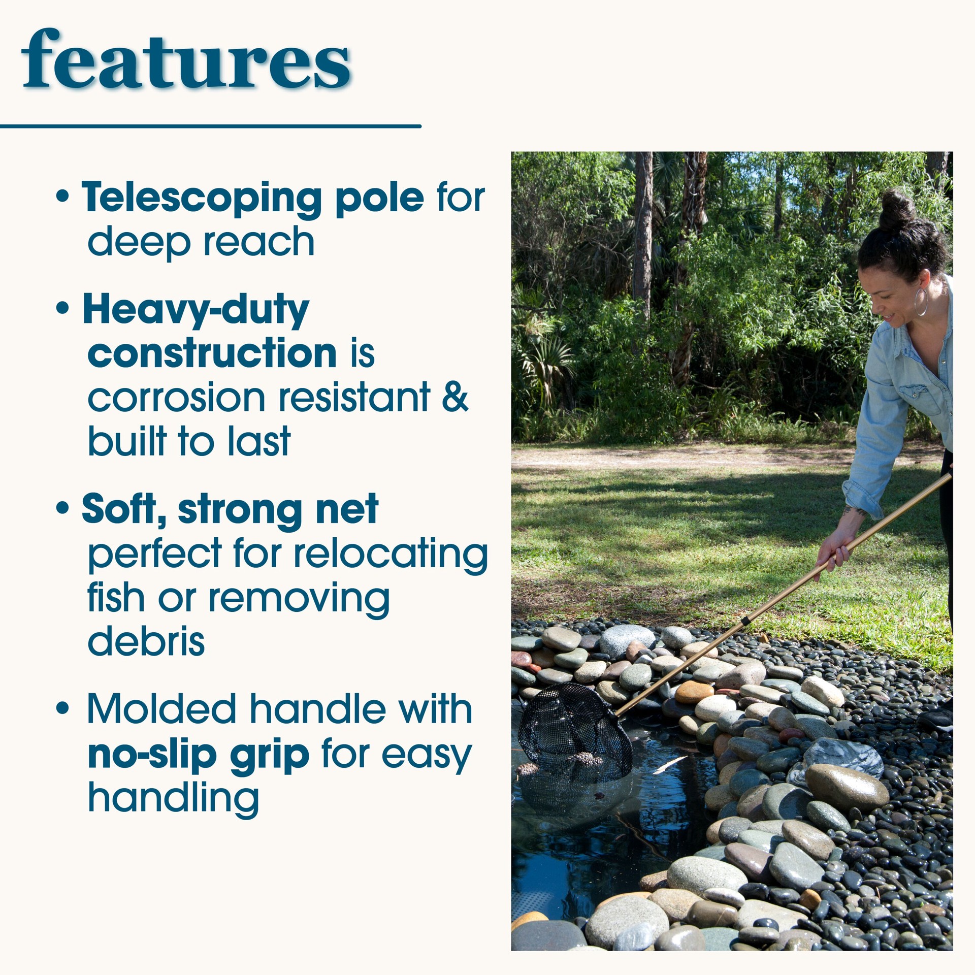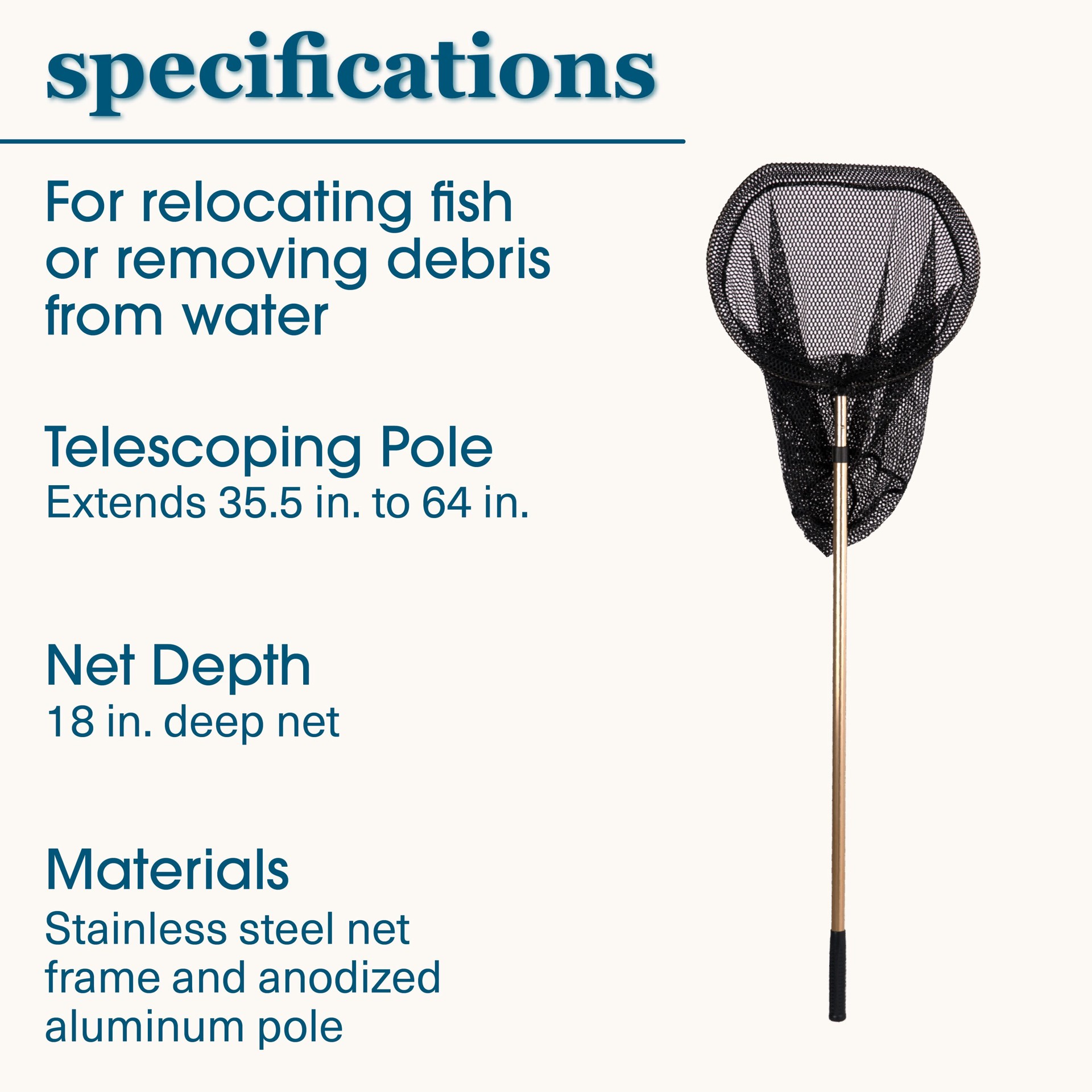 The smartpond Skimmer Fish Net is a lightweight, heavy-duty tool perfect for removing unwanted debris, moving fish, and performing general pond or pool maintenance tasks. This fish net's pole extends …