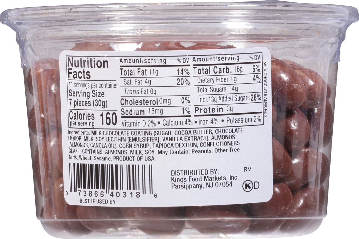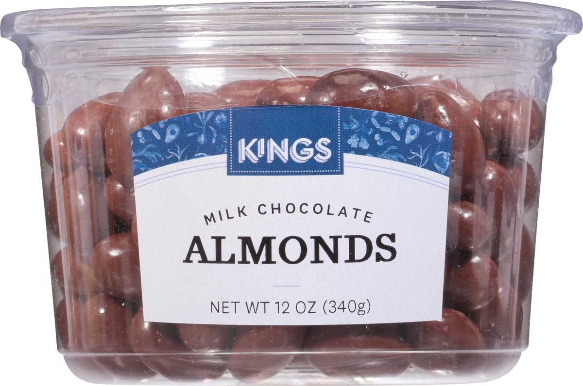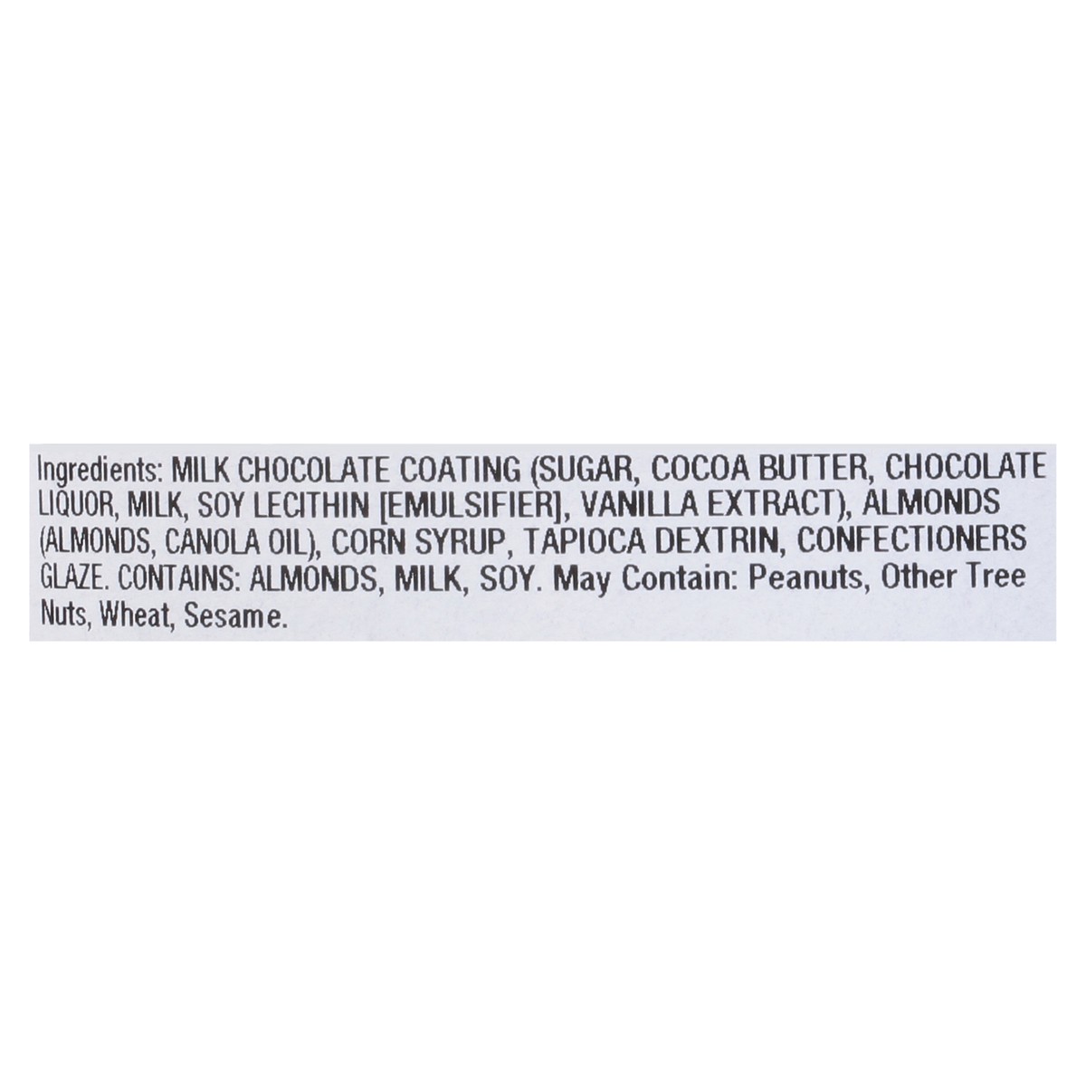 Milk Chocolate Coating (Sugar, Cocoa Butter, Chocolate Liquor, Milk, Soy Lecithin [Emulsifier], Vanilla Extract), Almonds (Almonds, Canola Oil), Corn Syrup, Tapioca Dextrin, Confectioners Glaze.