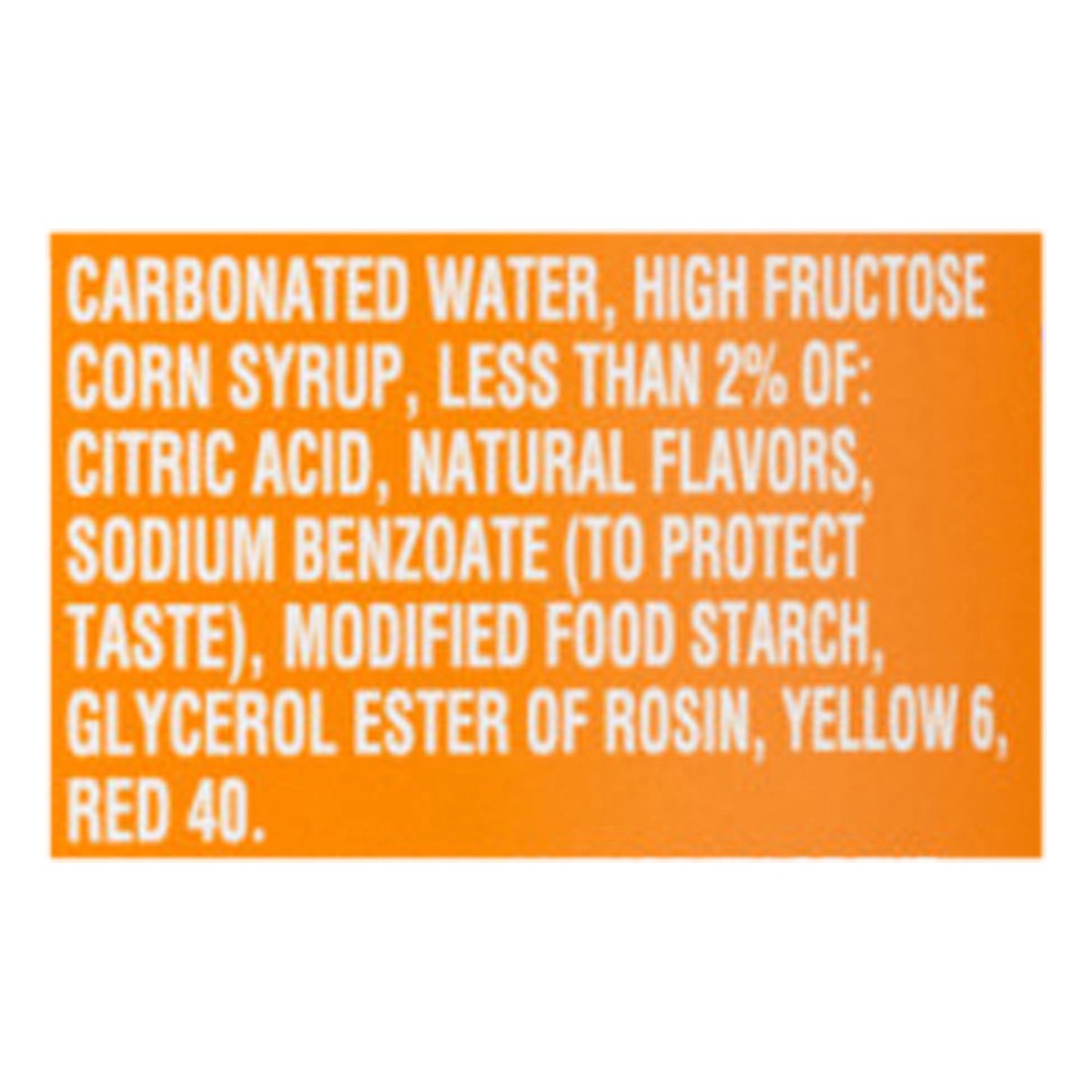Carbonated Water, High Fructose Corn Syrup, Less than 2% of: Citric Acid, Natural Flavors, Sodium Benzoate (to Protect Taste), Modified Food Starch, Glycerol Ester of Rosin, Yellow 6, Red 40.
