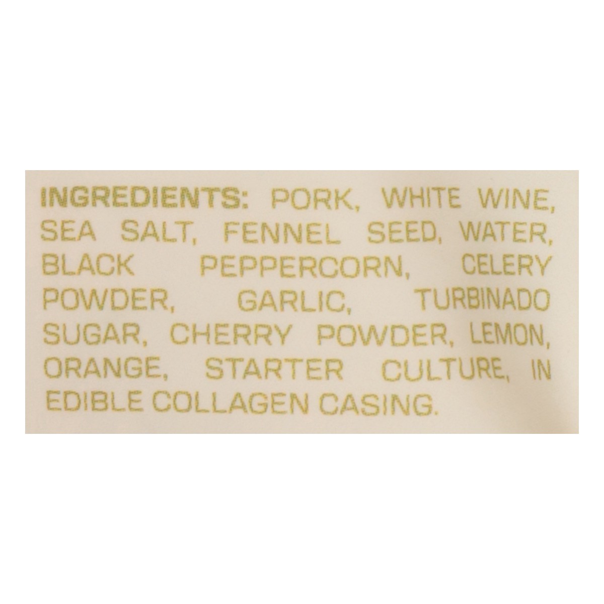 Pork, White Wine, Sea Salt, Fennel Seed, Water, Black Peppercorn, Celery Powder, Garlic, Turbinado Sugar, Cherry Powder, Lemon, Orange, Starter Culture, in Edible Collagen Casing.