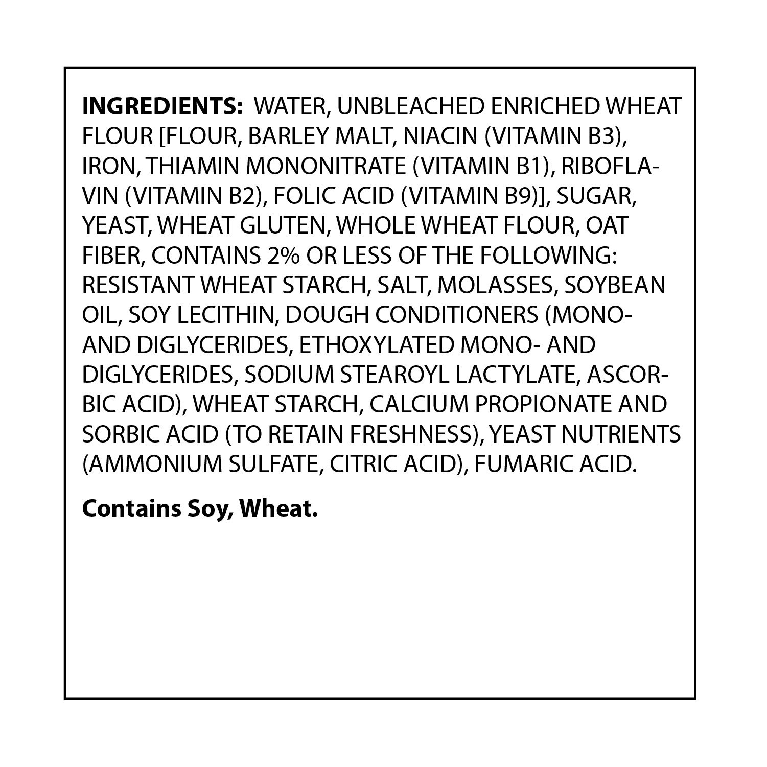 WATER, UNBLEACHED ENRICHED WHEAT FLOUR (WHEAT FLOUR, BARLEY MALT, NIACIN, IRON, THIAMIN MONONITRATE, RIBOFLAVIN, FOLIC ACID), OAT FIBER, SUGAR, WHOLE WHEAT FLOUR, YEAST, WHEAT GLUTEN, CONTAINS 2% OR L…