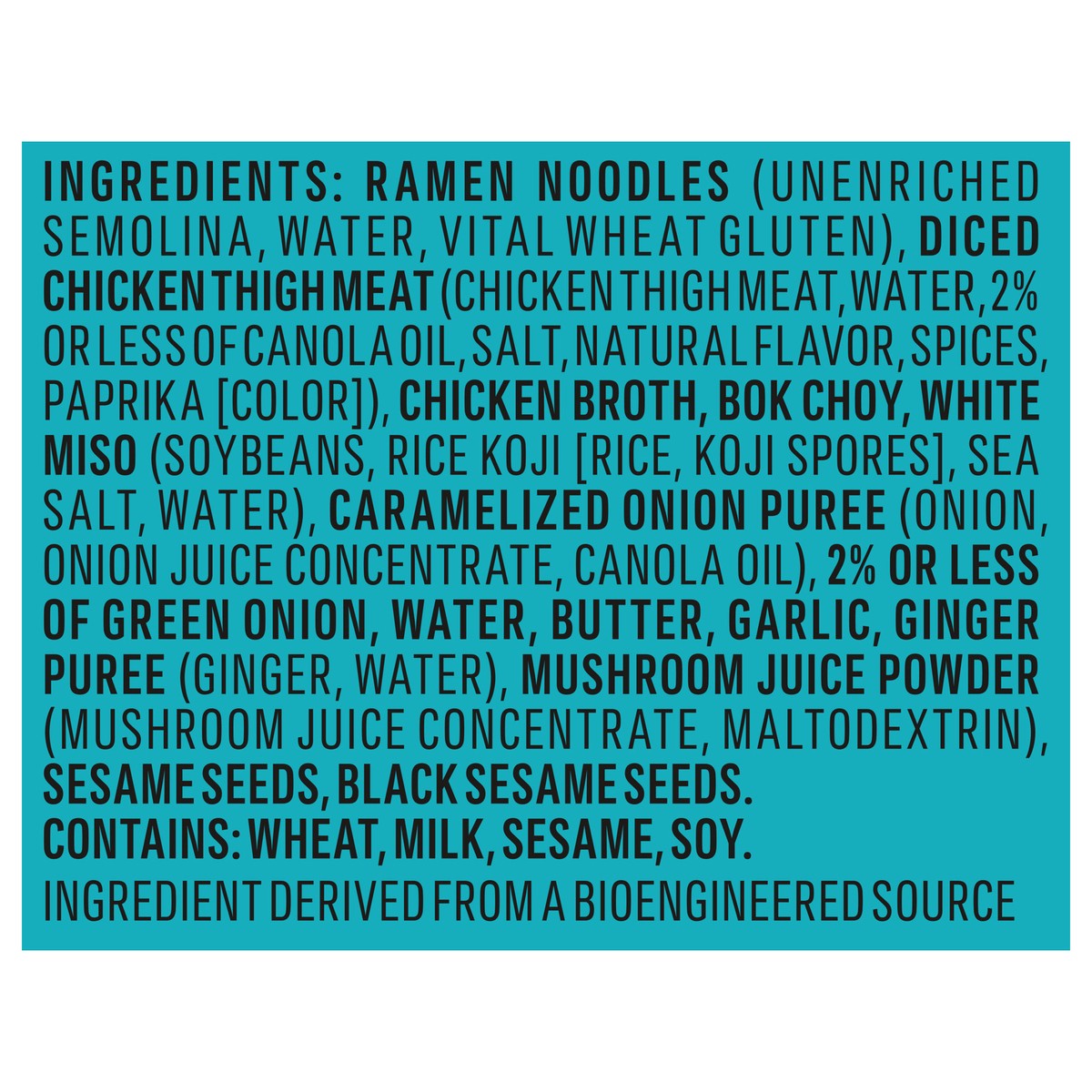 Ramen Noodles (Unenriched Semolina, Water, Vital Wheat Gluten), Diced Chicken Thigh Meat (Chicken Thigh Meat, Water. 2% or Less of Canola Oil, Salt, Natural Flavor, Spices, Paprika [Color]), Chicken B…