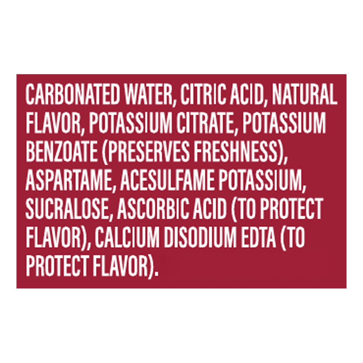 Carbonated Water, Citric Acid, Natural Flavor, Potassium Citrate, Potassium Benzoate (Preserves Freshness), Aspartame, Acesulfame Potassium, Sucralose, Ascorbic Acid (to Protect Flavor), Calcium Disod…