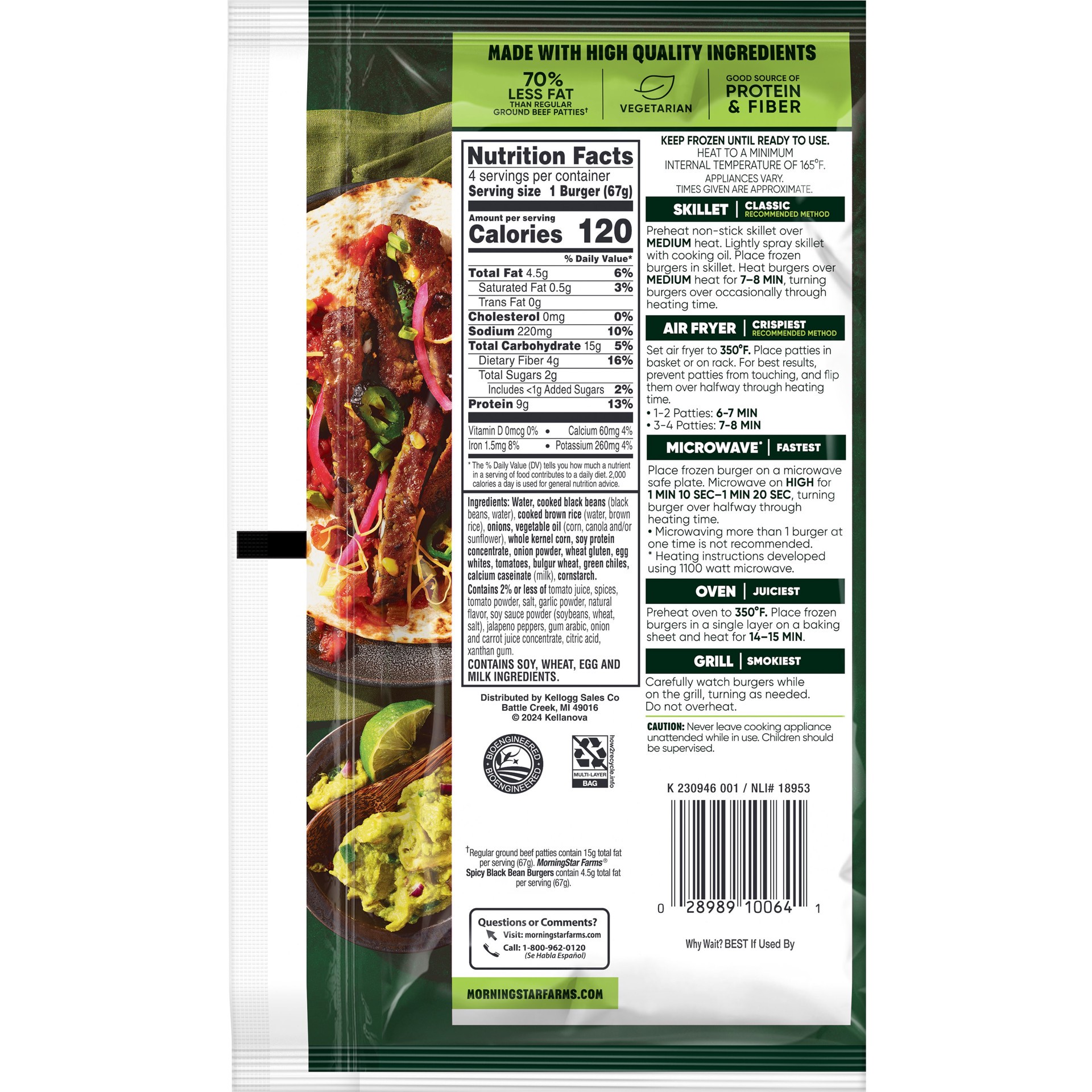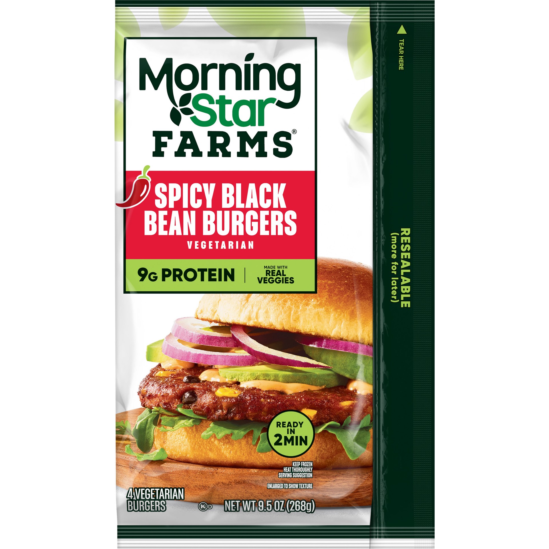 MorningStar Farms Spicy Black Bean veggie burgers are crisp and tender, made with a savory blend of black beans, brown rice, onions, corn, and tomatoes for bold flavor in every bite. With 70% less fat…