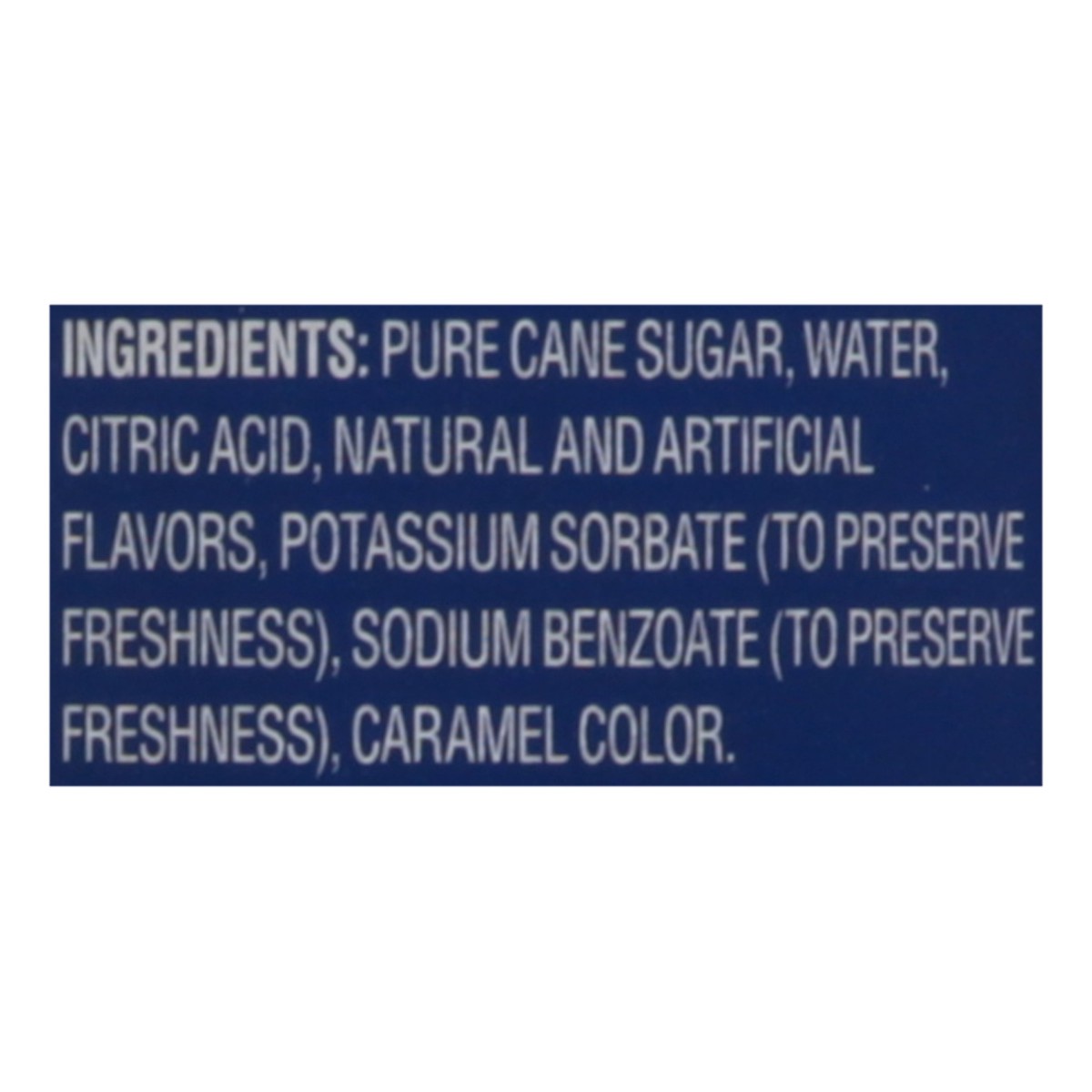 Pure Cane Sugar, Water, Citric Acid, Natural and Artificial Flavors, Potassium Sorbate (to Preserve Freshness), Sodium Benzoate (to Preserve Freshness), Caramel Color.