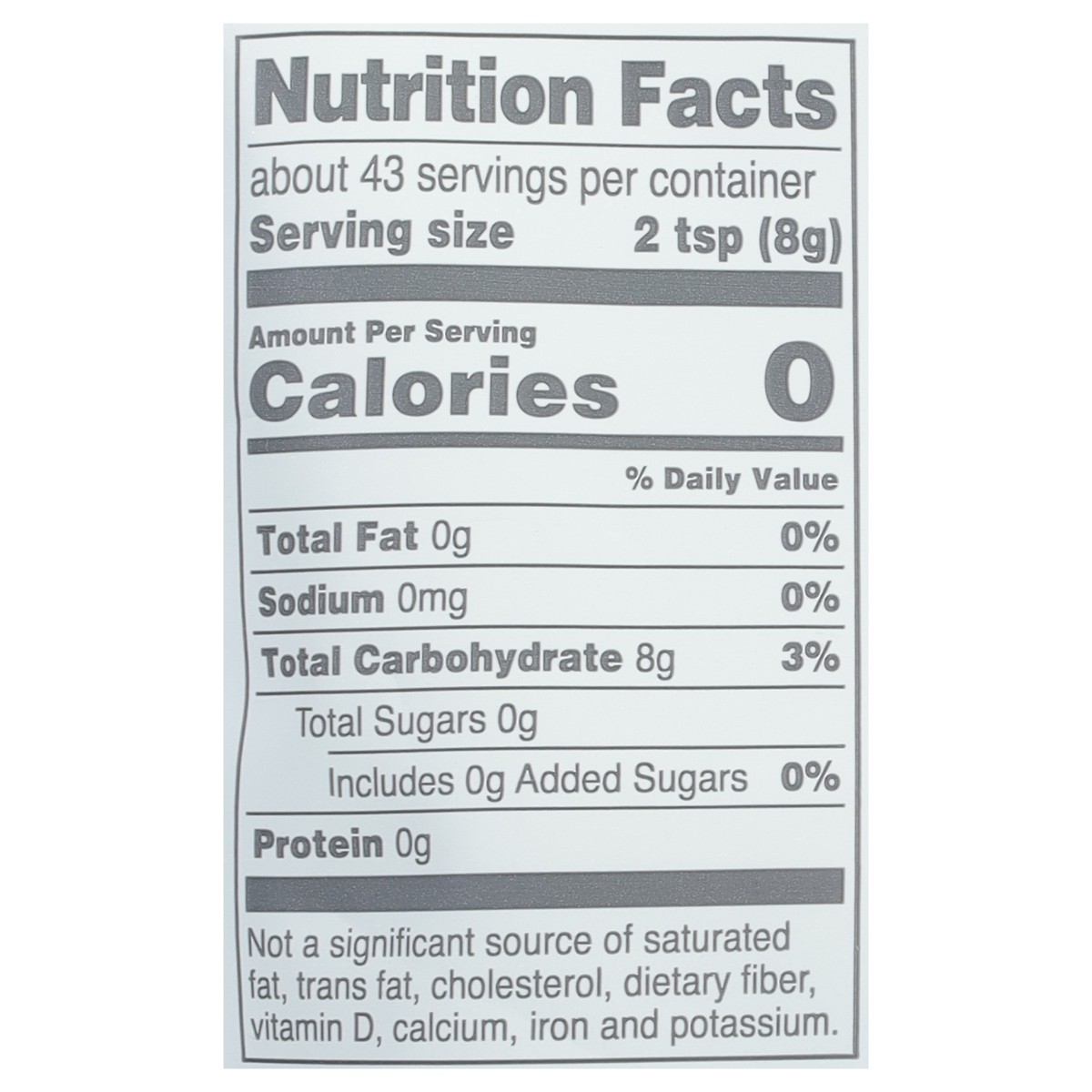 No artificial colors, flavors or preservatives. 0 g sugar. Gluten free. No sugar alcohol. Keto friendly. 0 calories. The ultimate sugar replacement. Measures & bakes like sugar. This delicious, versat…