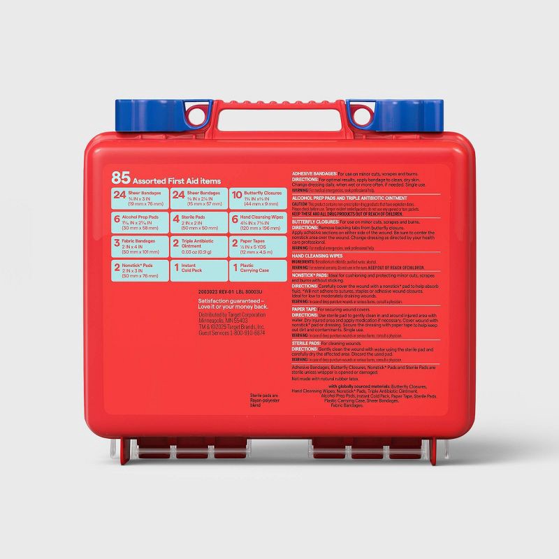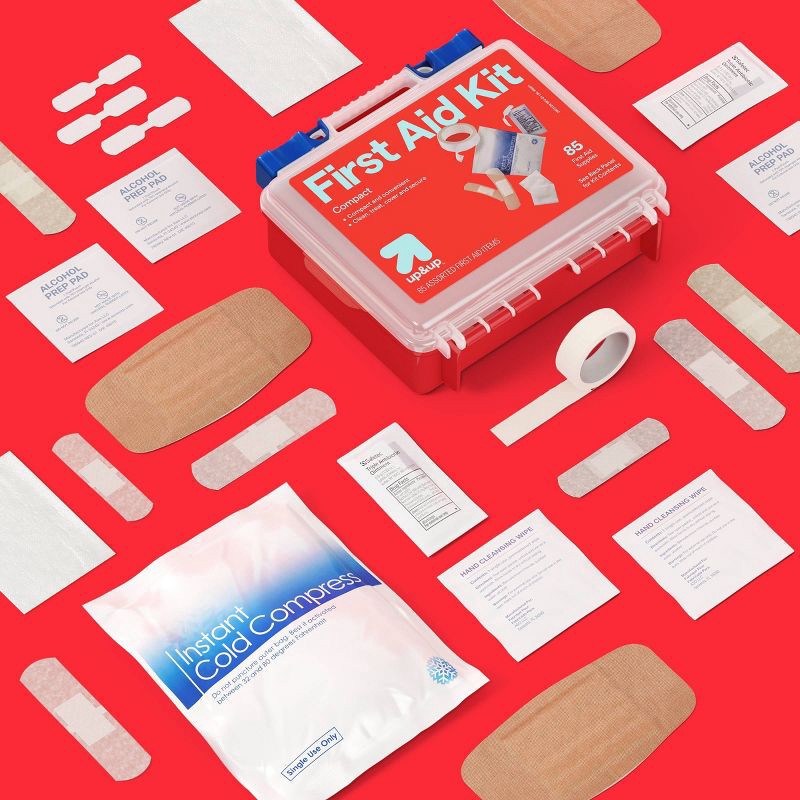 This 85-Piece First Aid Kit from up&up™ keeps a variety of first aid essentials neatly stored and within easy reach. This home first aid kit comes with 85 total pieces, including bandages, butterfly c…