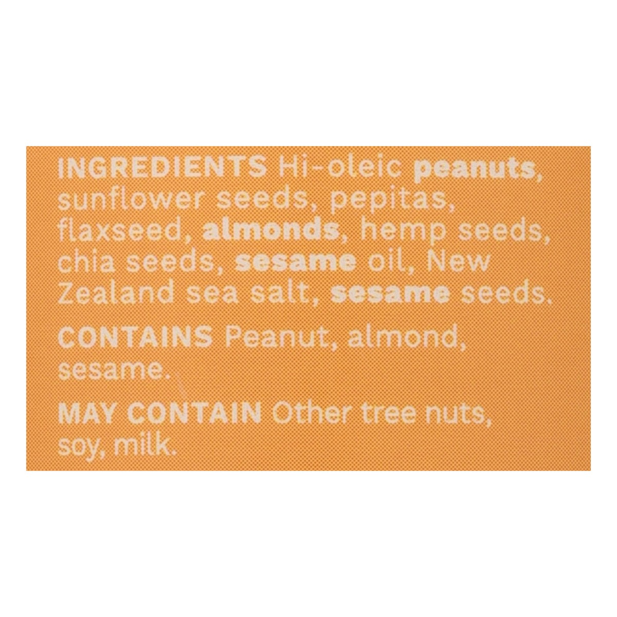 Hi-Oleic Peanuts, Sunflower Seeds, Pepitas, Flaxseed, Almonds, Hemp Seeds, Chia Seeds, Sesame Oil, New Zealand Sea Salt, Sesame Seeds.