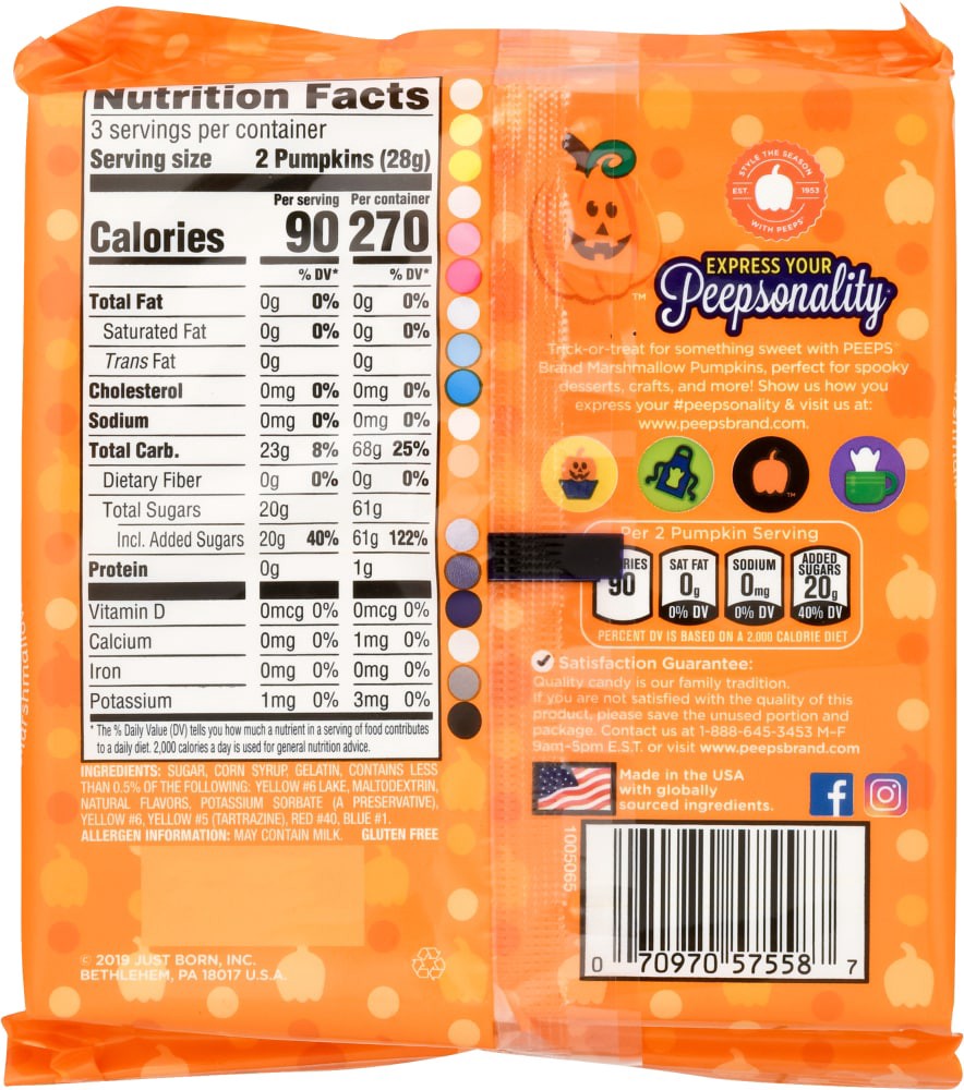 3 Servings Per Package: 45 calories per pumpkin. 90 calories per serving. Per 2 Pumpkin Serving: calories 90; sat fat 0 g (0% DV); sodium 0 mg (0% DV); added sugars 20 g (40% DV). Percent DV is based …