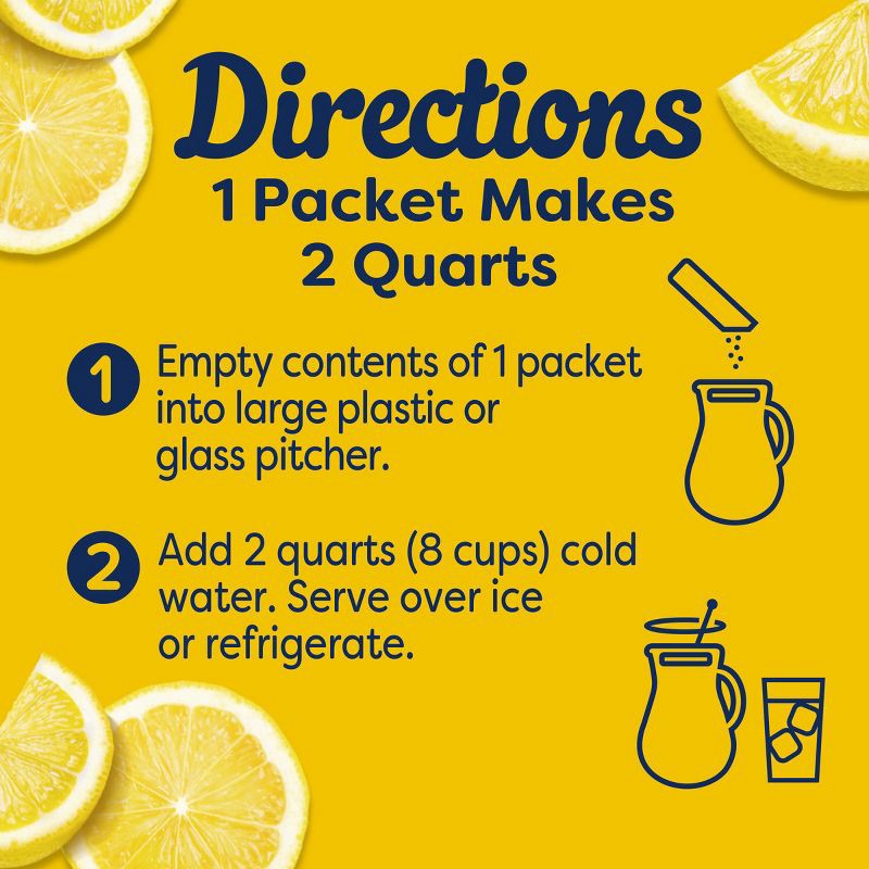 - PITCHER DRINK MIX: One pre-portioned powder drink mix packet makes 2 quarts of lemonade