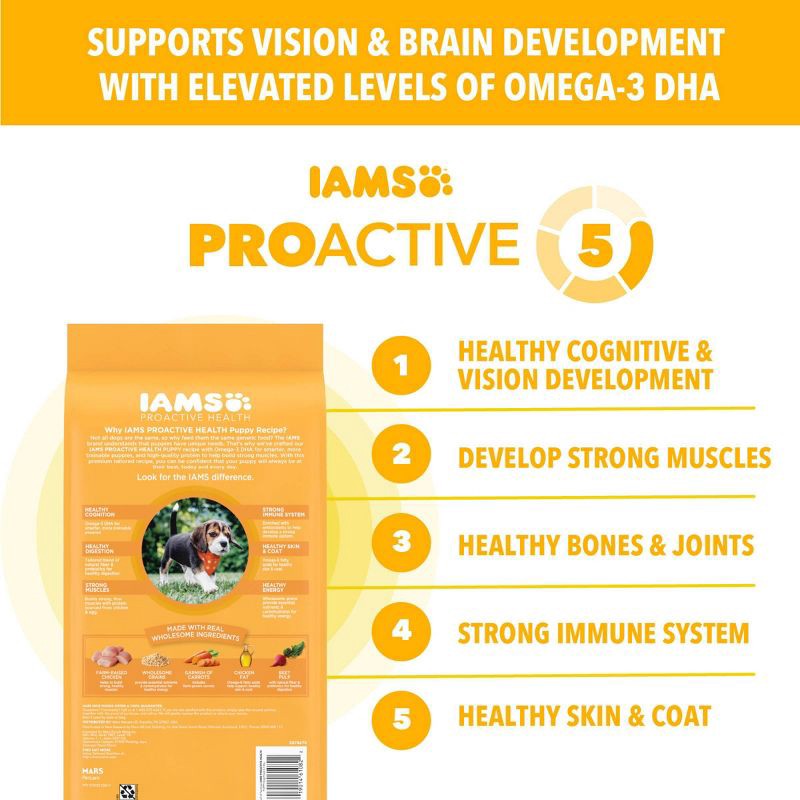 - The Proactive 5 health benefits for IAMS Puppy are scientifically designed to support five key areas of your dog's health, keeping them full of life, for more life.