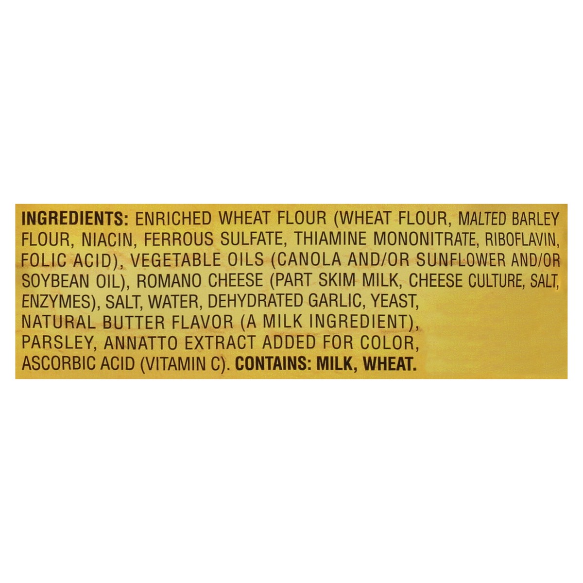 Enriched Wheat Flour (Wheat Flour, Malted Barley Flour, Niacin, Ferrous Sulfate, Thiamine Mononitrate, Riboflavin, Folic Acid), Vegetable Oils (Canola and/or Sunflower and/or Soybean Oil), Romano Chee…