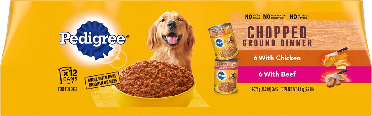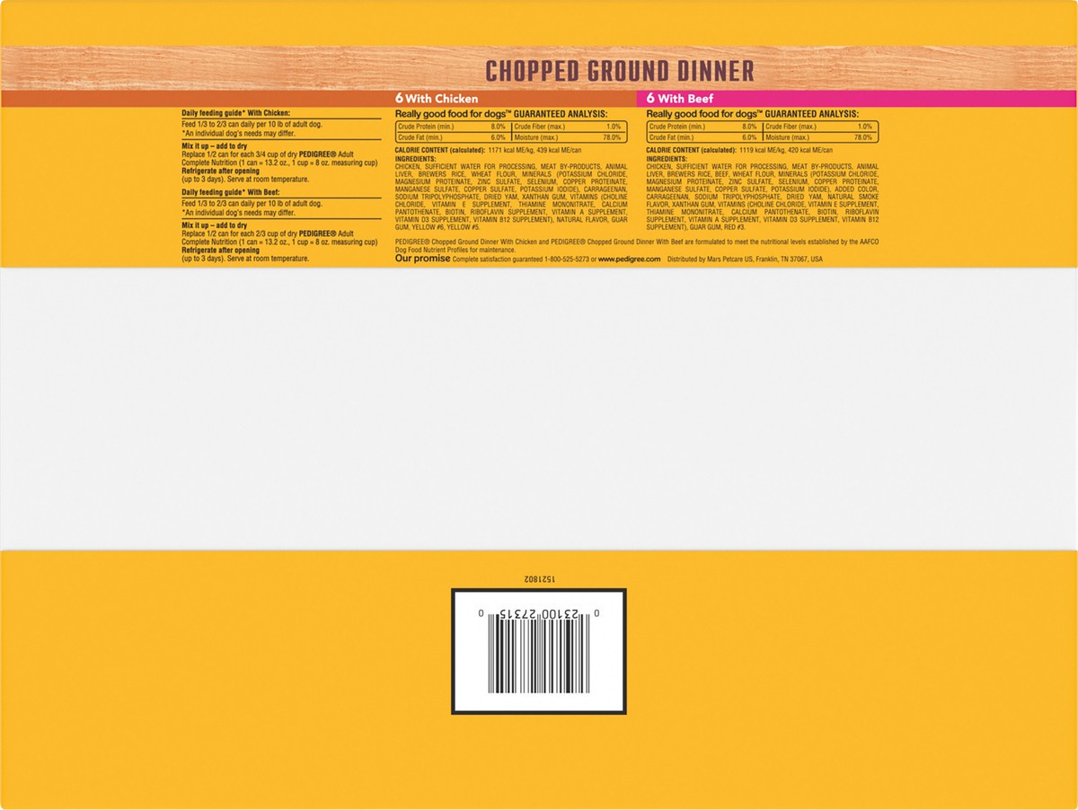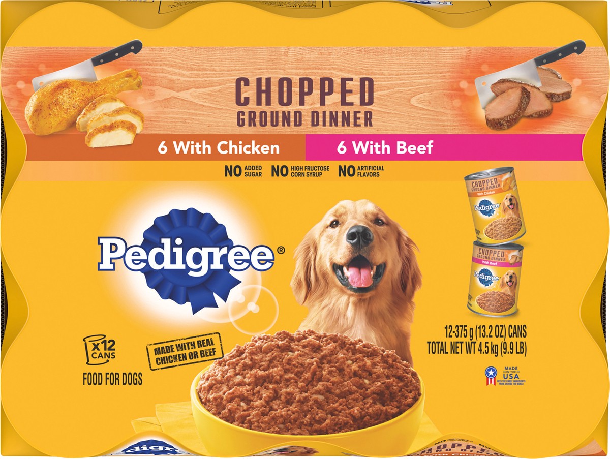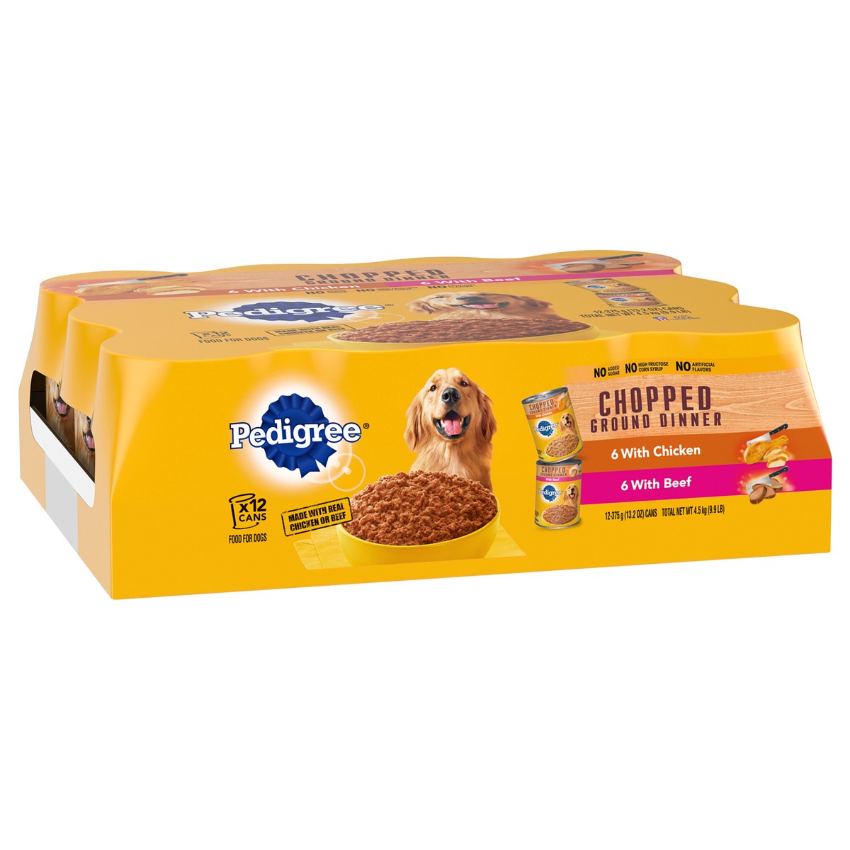 PEDIGREE CHOPPED GROUND DINNER soft, wet dog food with chicken and with beef gives your dog the flavors they crave with the nutrition they need. Your adult dog can enjoy the delicious taste of real ch…