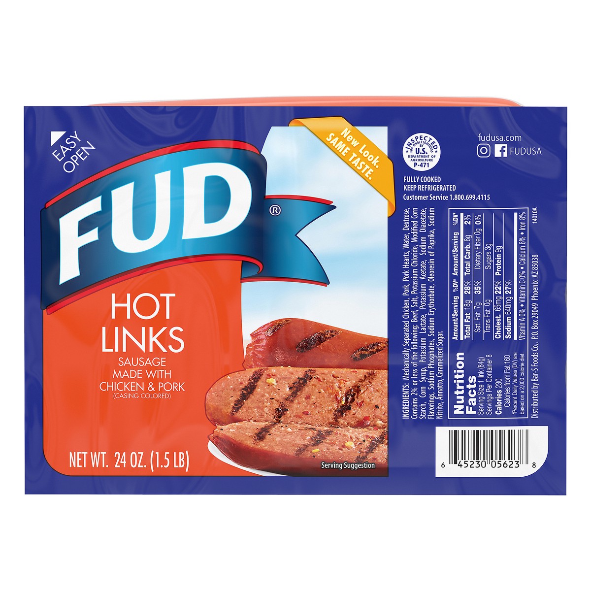 Sausage made with chicken & pork (casing colored). New look. Same taste. Fully cooked. Inspected for wholesomeness by US Department of Agriculture. fudusa.com. Instagram. Facebook: fudusa. Customer Se…
