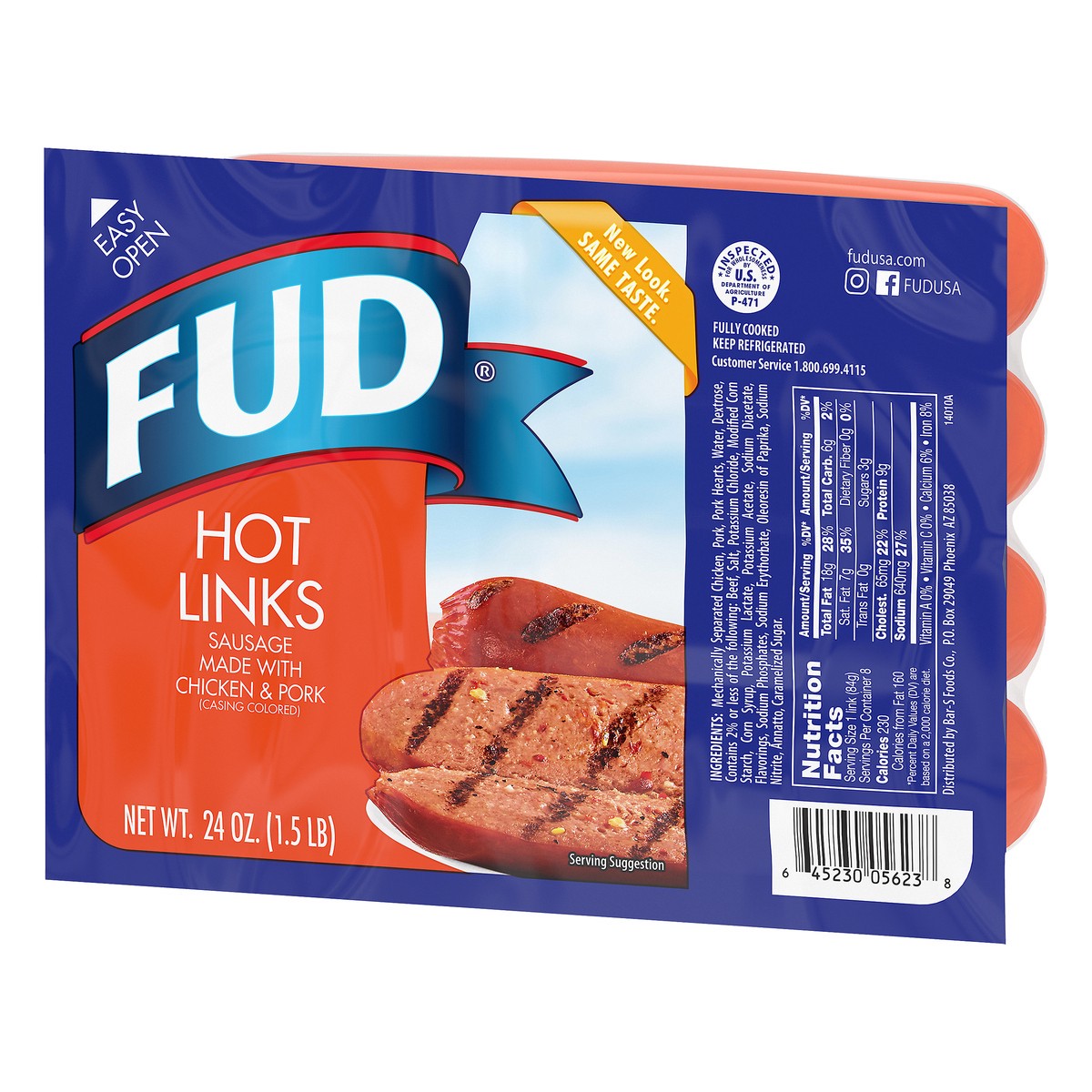 Sausage made with chicken & pork (casing colored). New look. Same taste. Fully cooked. Inspected for wholesomeness by US Department of Agriculture. fudusa.com. Instagram. Facebook: fudusa. Customer Se…