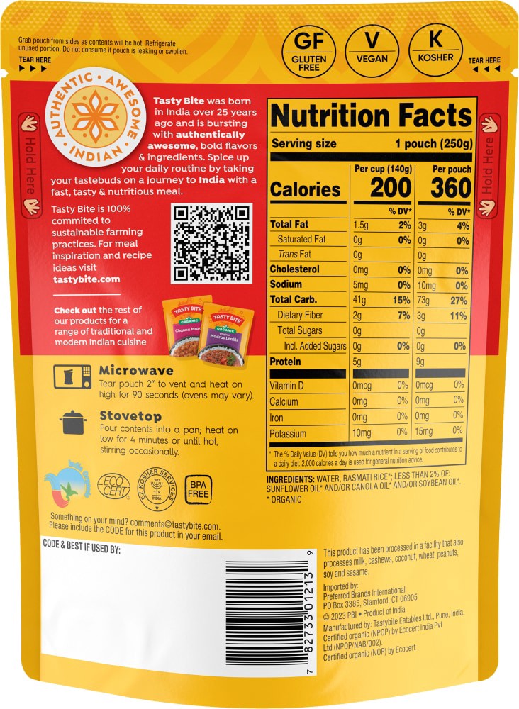 Fully cooked Basmati Rice from India. Plain. Simple. Organic. A perfect accompaniment for any of our Tasty Bite entrees.