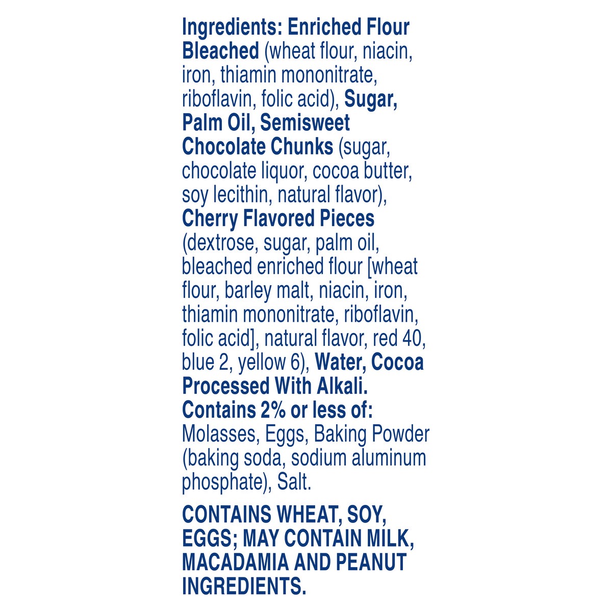 Enriched Flour Bleached (Wheat Flour, Niacin, Iron, Thiamin Mononitrate, Riboflavin, Folic Acid), Sugar, Palm Oil, Semisweet Chocolate Chunks (Sugar, Chocolate Liquor, Cocoa Butter, Soy Lecithin, Natu…