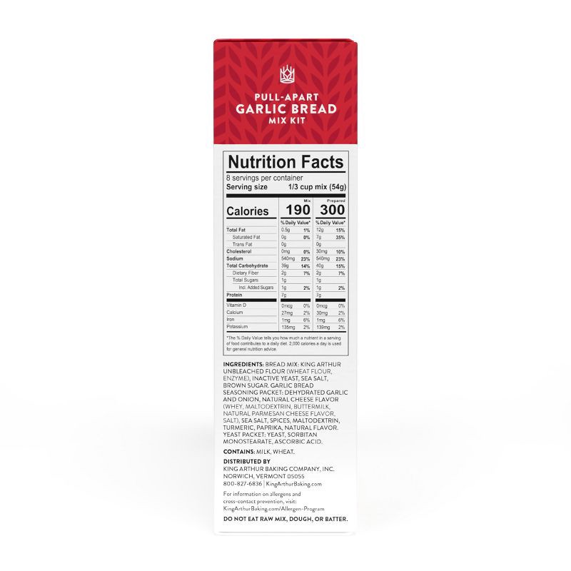 Bread Mix: King Arthur Unbleached Flour (Wheat Flour, Enzyme), Inactive Yeast, Sea Salt, Brown Sugar, Garlic Bread Seasoning Packet: Dehydrated Garlic and Onion, Natural Cheese Flavor (Whey, Maltodext…
