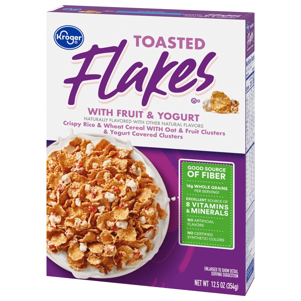 Kroger® Toasted Flakes with Fruit & Yogurt Cereal packs flakes of rice and whole grain along with fruit clusters into every bowl. Satisfy your morning hunger with a satisfying crunch and hints of hone…