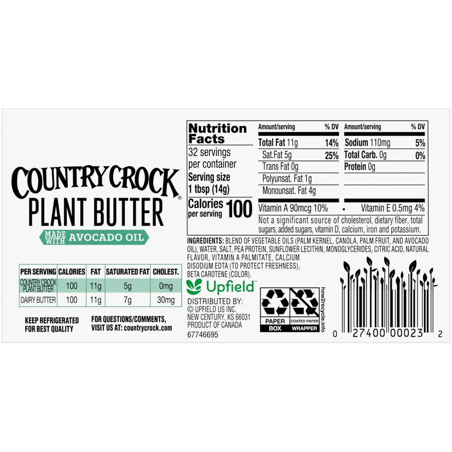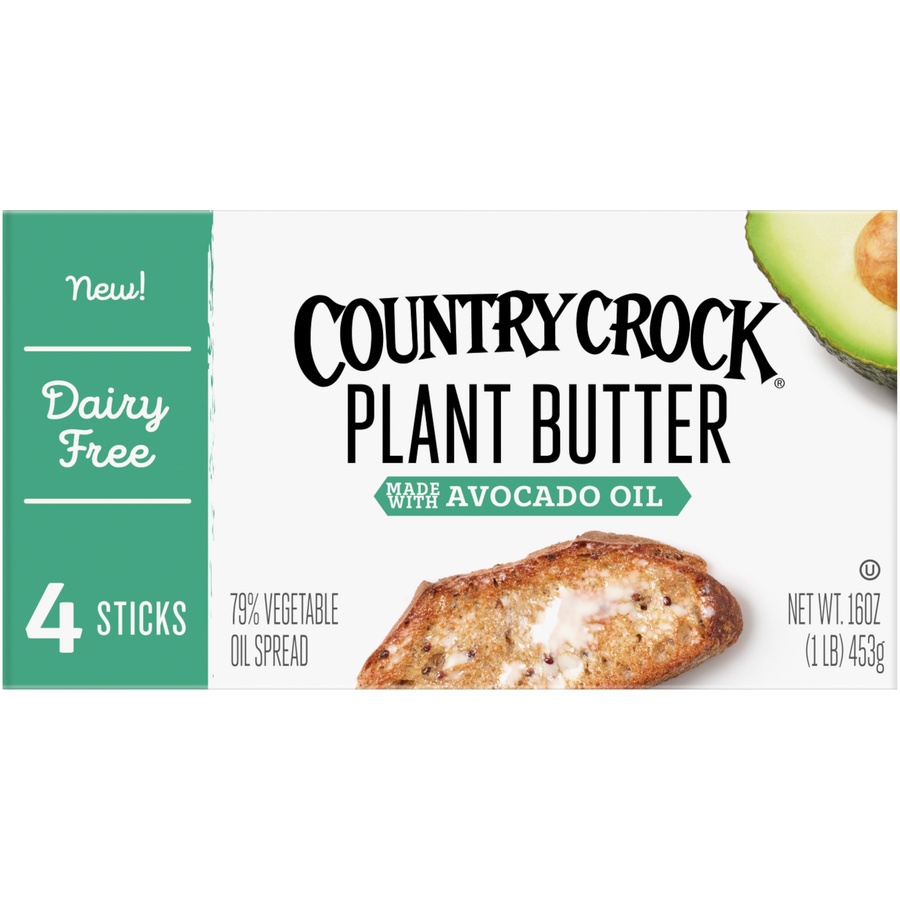 Oil spread. Country Crock Plant Butter: Per Serving: 100 calories; 11 g fat; 5 g saturated fat; 0 mg cholest. Dairy Butter: Per Serving: 100 calories; 11 g fat; 7 g saturated fat; 30 mg cholest. Dairy…