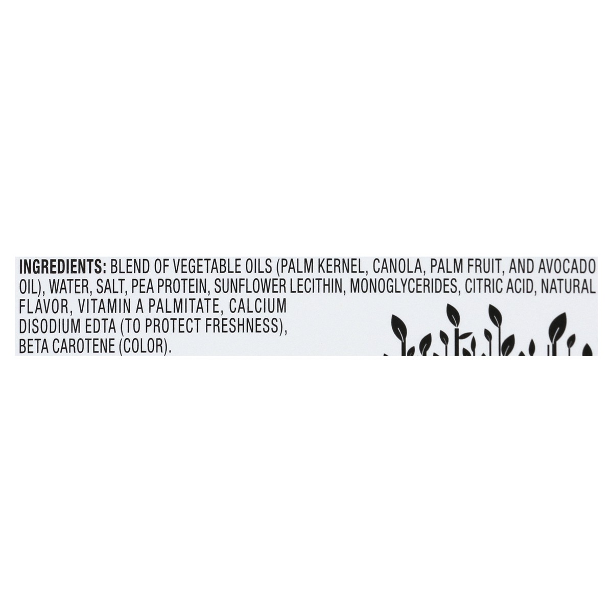Blend of Vegetable Oils (Palm Kernel, Canola, Palm Fruit, and Avocado Oil), Water, Salt, Pea Protein, Sunflower Lecithin, Monoglycerides, Citric Acid. Natural Flavor, Vitamin A Palmitate, Calcium Diso…