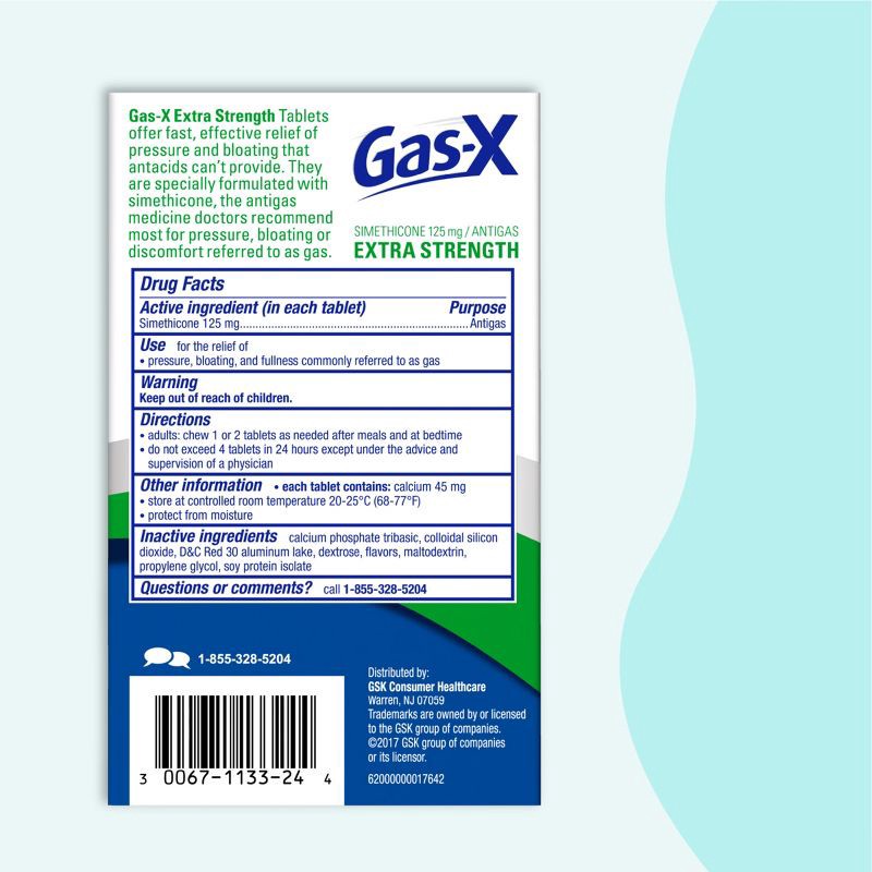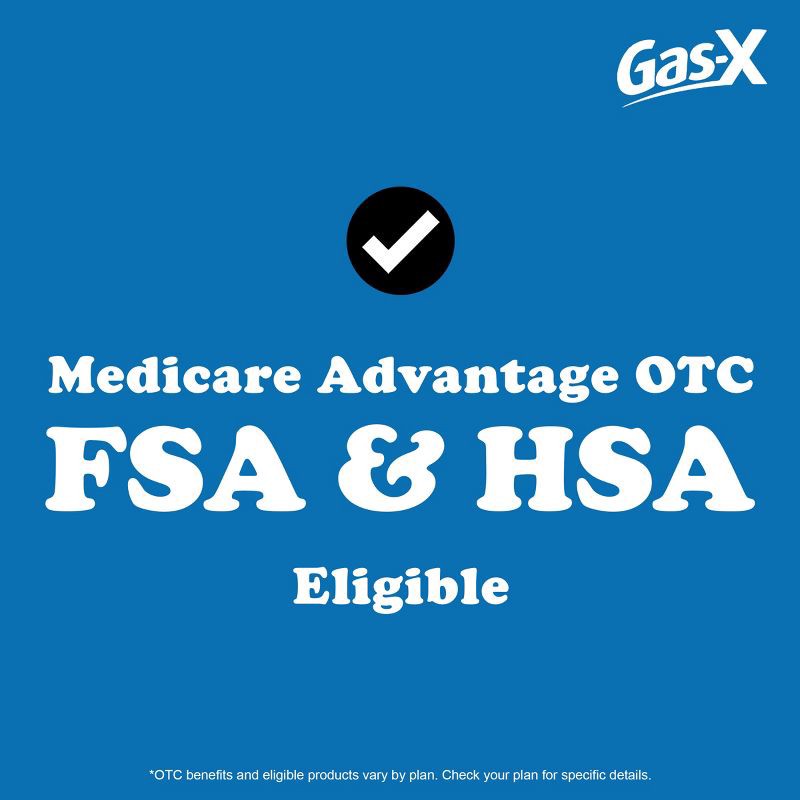 - One 72 count package of Gas-X Extra Strength Gas Relief Softgels with Simethicone 125 mgGas-X simethicone anti gas softgels provide fast gas and bloating reliefGas-X antigas simethicone antigas softgels relieve gas in minutes to provide bloating and gas reliefContains 125 mg of simethicone for fast gas reliefSimethicone extra strength gas pills are easy to takeHSA and FSA eligible item. Medicare Advantage OTC (MAOTC) eligible. *OTC benefits and eligible products vary by plan. Check your plan for specific details.