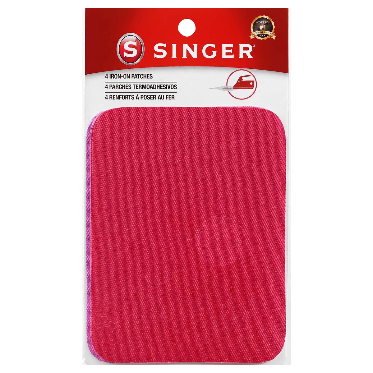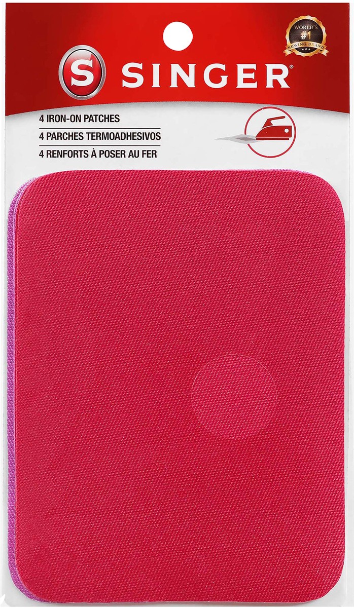 The SINGER Fabric Iron-On Patches in Bright Magenta and Bright Purple are the easy solution to both apparel repairs and clothing embellishments. Each package contains four patches, two in bright magen…