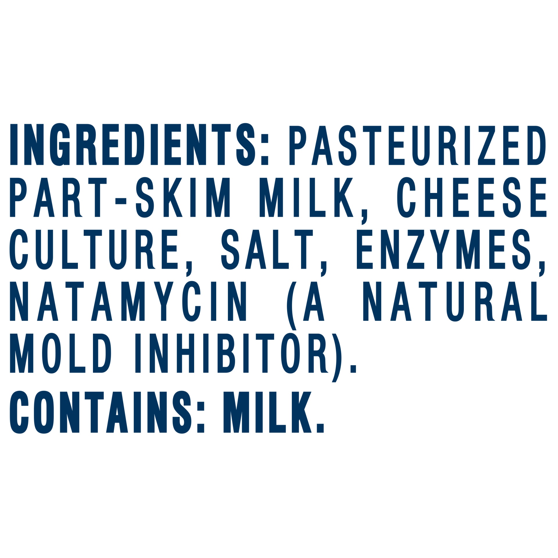 Pasteurized Part-Skim Milk, Cheese Culture, Salt, Enzymes, Natamycin (a Natural Mold Inhibitor).