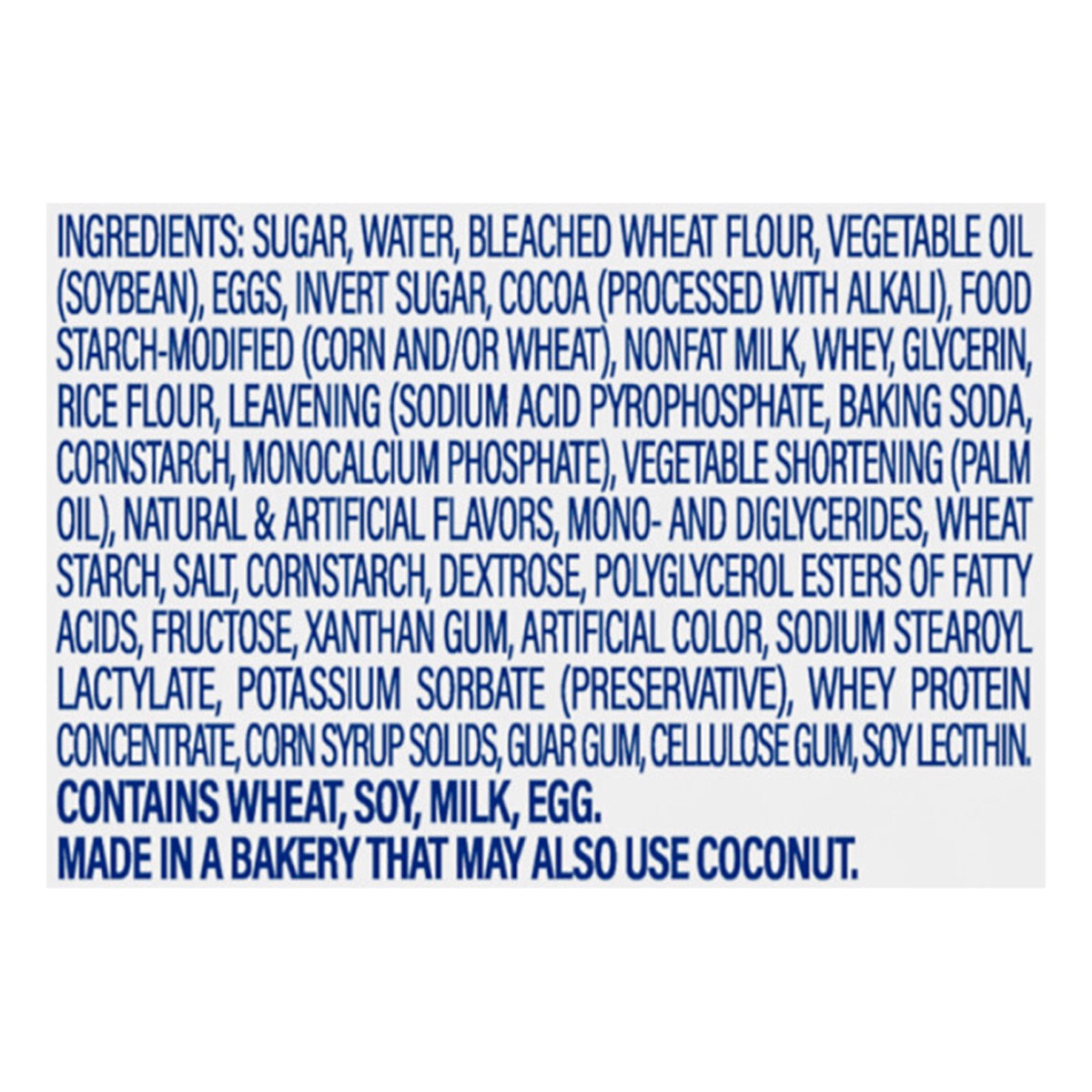 Sugar, Water, Bleached Wheat Flour, Vegetable Oil (Soybean), Eggs, Invert Sugar, Cocoa (Processed with Alkali), Food Starch-Modified (Corn and/or Wheat), Nonfat Milk, Whey, Glycerin, Rice Flour, Leave…