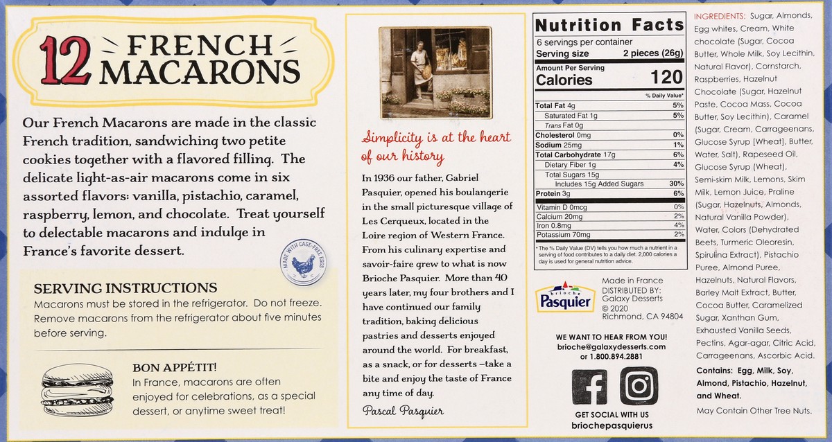 Vanilla. Pistachio. Caramel. Raspberry. Lemon. Chocolate. 12. Made with cage-free eggs. Our French macarons are made in the classic French tradition, sandwiching two petite cookies together with a fla…