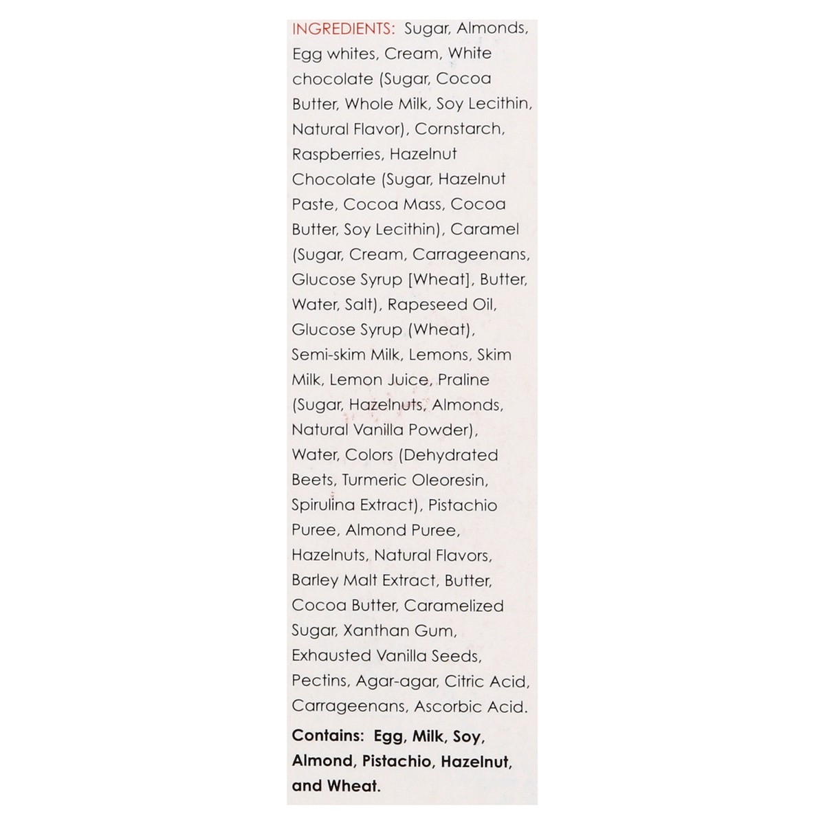 Sugar, Almonds, Egg Whites, Cream, White Chocolate (Sugar, Cocoa Butter, Whole Milk, Soy Lecithin, Natural Flavor), Cornstarch, Raspberries, Hazelnut Chocolate (Sugar, Hazelnut Paste, Cocoa Mass, Coco…